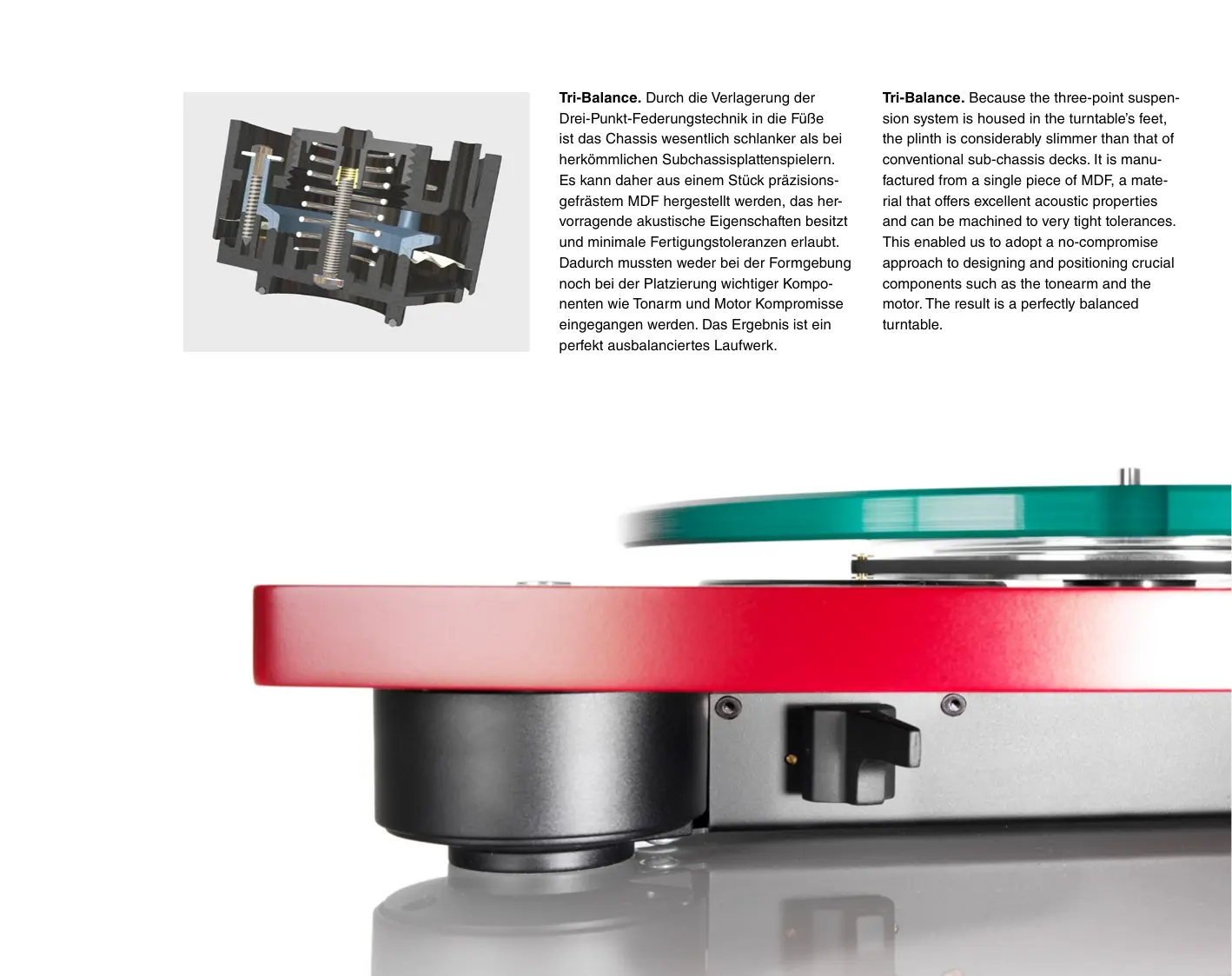 Tri-Balance. Durch die Verlagerung der Drei-Punkt-Federungstechnik in die Fußist das Chassis wesentlich schlanker als bei herkommlichen Subchassisplattenspielern. Es kann dazu aus einem Stück prazisionsgefrastem MDF hergestellt werden, das hervorragende akustische Eigenschaften besitzt und minimale Fertigungstoleranzen erlaubt. Dadurch mussten weder bei der Formgebung noch bei der Platzierung wichtiger Komponenten wie Tonarm und Motor Kompromise eingegangen werden. Das Ergebnis ist ein perfect ausbalanciertes Laufwerk.