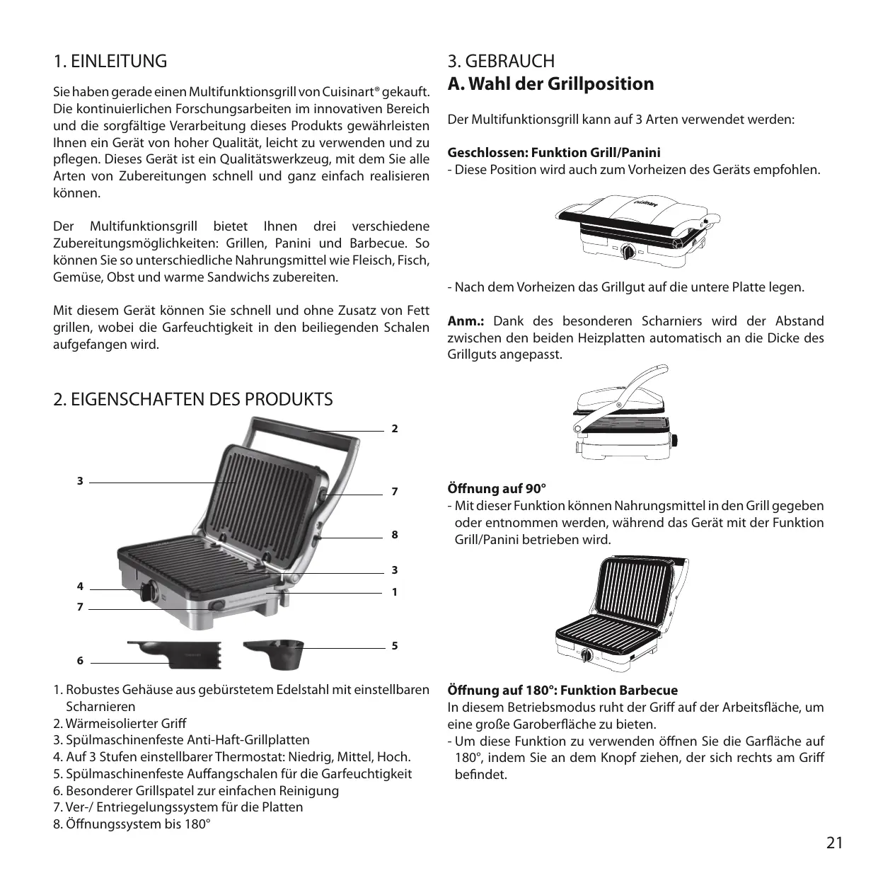 A. Wahl der Grillposition Der Multifunktionsgrill kann auf 3 Arten verwendet werden: Geschlossen: Funktion Grill/Panini - Diese Position wird auch zum Vorheizen des Geräts empfohlen. - Nach dem Vorheizen das Grillgut auf die untere Platte legen. Anm.: Dank des besonderen Scharniers wird der Abstand zwischen den beiden Heizplatten automatisch an die Dicke des Grillguts angepasst.