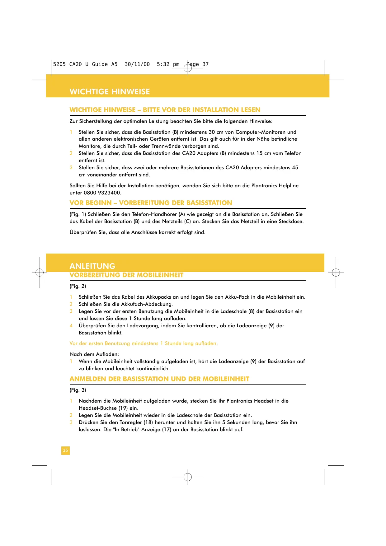 Stellen Sie sicher, dass die Basisstation (B) mindestens 30 cm von Computer-Monitoren und allen anderen elektronischen Geräten entfernt ist. Das gilt auch für in der Nähe befindliche Monitore, die durch Teil- oder Trennwände verborgen sind. Stellen Sie sicher, dass die Basisstation des CA20 Adapters (B) mindestens 15 cm vom Telefon entfernt ist. Stellen Sie sicher, dass zwei oder mehrere Basisstationen des CA20 Adapters mindestens 45 cm voneinander entfernt sind. Sollten Sie Hilfe bei der Installation benötigen, wenden Sie sich bitte an die Plantronics Helpline unter 0800 9323400.