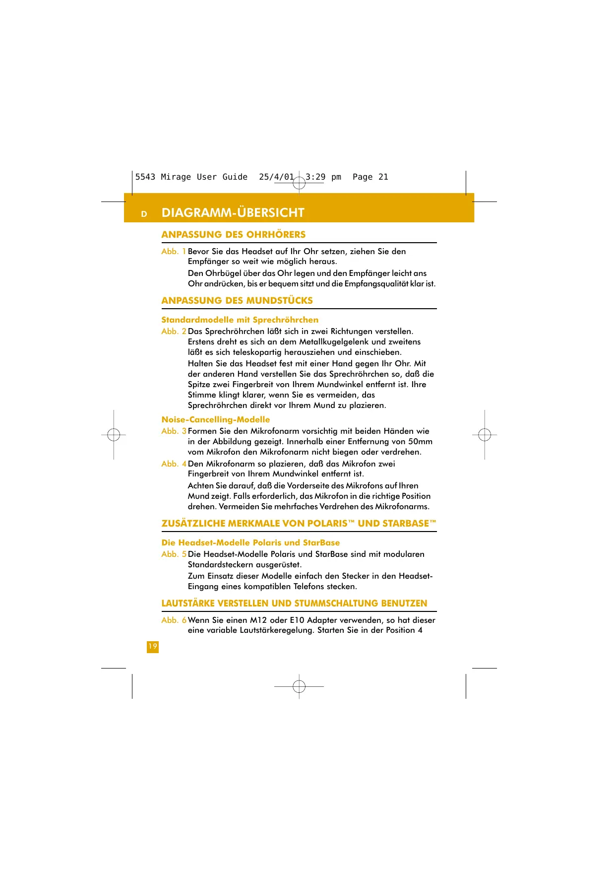 Standardmodelle mit Sprechröhrchen Abb. 2 Das Sprechröhrchen läßt sich in zwei Richtungen verstellen. Erstens dreht es sich an dem Metallkugelgelenk und zweitens läßt es sich teleskopartig herausziehen und einschieben. Halten Sie das Headset fest mit einer Hand gegen Ihr Ohr. Mit der anderen Hand verstellen Sie das Sprechröhrchen so, daß die Spitze zwei Fingerbreit von Ihrem Mundwinkel entfernt ist. Ihre Stimme klingt klarer, wenn Sie es vermeiden, das Sprechröhrchen direkt vor Ihrem Mund zu plazieren. Noise-Cancelling-Modelle Abb. 3 Formen Sie den Mikrofonarm vorsichtig mit beiden Händen wie in der Abbildung gezeigt. Innerhalb einer Entfernung von 50mm vom Mikrofon den Mikrofonarm nicht biegen oder verdrehen. Abb. 4 Den Mikrofonarm so plazieren, daß das Mikrofon zwei Fingerbreit von Ihrem Mundwinkel entfernt ist. Achten Sie darauf, daß die Vorderseite des Mikrofons auf Ihren Mund zeigt. Falls erforderlich, das Mikrofon in die richtige Position drehen. Vermeiden Sie mehrfaches Verdrehen des Mikrofonarms. ZUSÄTZLICHE MERKMALE VON POLARIS™ UND STARBASE™ Die Headset-Modelle Polaris und StarBase Abb. 5 Die Headset-Modelle Polaris und StarBase sind mit modularen Standardsteckern ausgerüstet. Zum Einsatz dieser Modelle einfach den Stecker in den HeadsetEingang eines kompatiblen Telefons stecken.