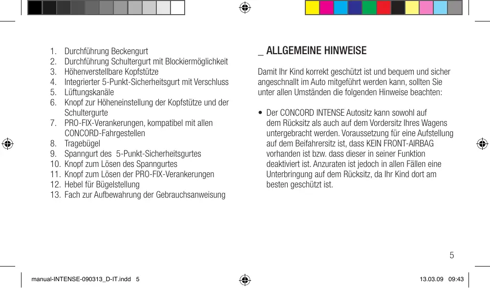- Der CONCORD INTENSE Autositz ist nicht für Fahrzeuge mit Front-Airbag geeignet, sofern dieser nicht abgeschaltet bzw. deaktiviert werden kann. Im Zweifelsfalle ist der zuständige Hersteller oder Vertriebshändler zurate zu ziehen.