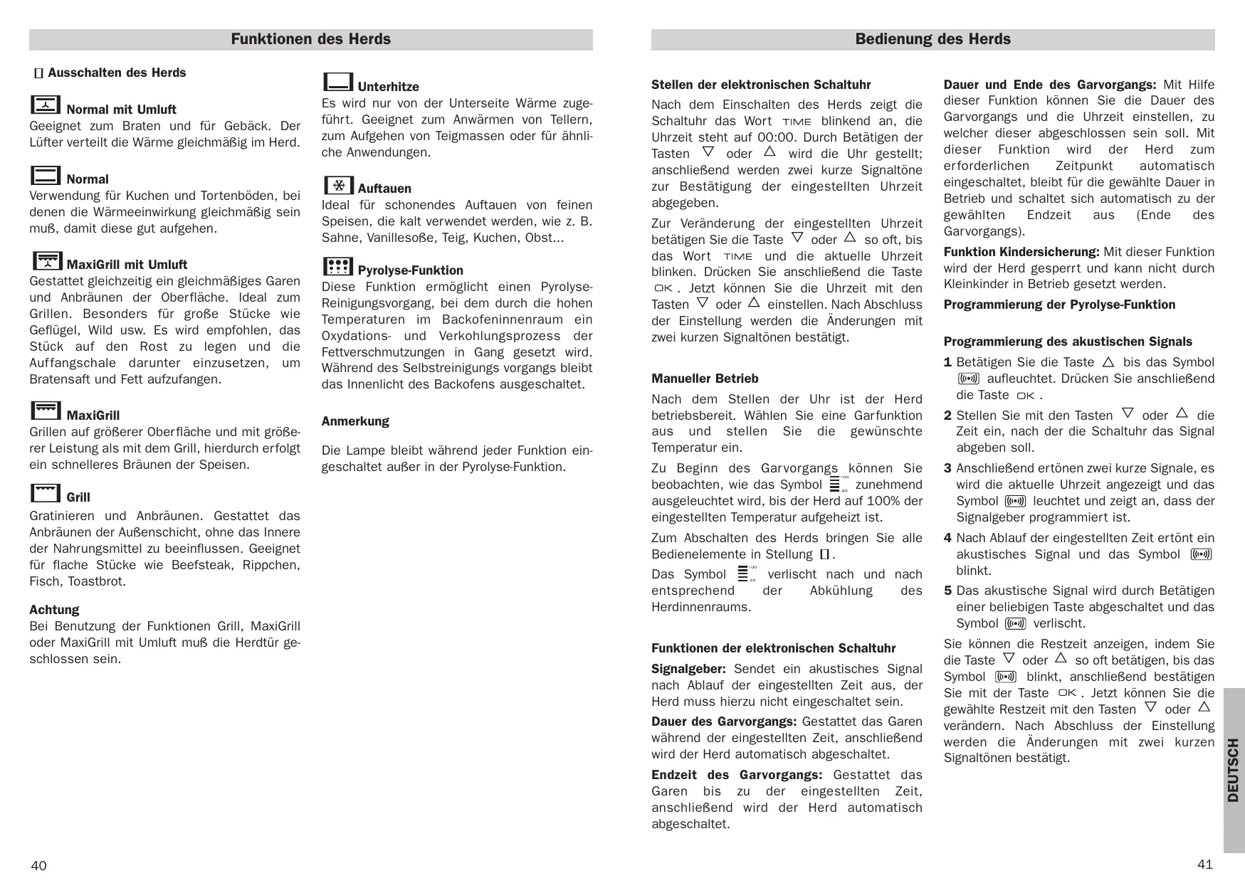 Conventionnel avec turbine Recommandé pour les rôtis et la pâtisserie. Le ventilateur répartit la chaleur de façon uniforme à l'intérieur du four. Conventionnel Utiliser pour les gâteaux et les tartes qui doivent recevoir une chaleur uniforme et pour obtenir une texture moelleuse. MaxiGrill avec turbine Permet en même temps de rôtir de façon uniforme et de dorer superficiellement. Idéal pour les grillades. Spécial pour les pièces volumineuses telles que les volailles, le gibier... Il est recommandé de placer la pièce de viande sur la grille du four et la lèchefrite en dessous pour recueillir les jus de cuisson ou la graisse.