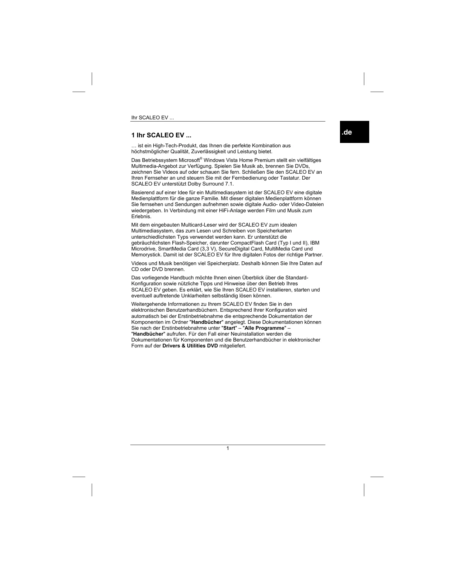 Weitergehende Informationen zu Ihrer SCALEO EV finden Sie in den elektronischen Benutzerhandbuchern. Entsprechend ihrer Konfiguration wird automatisch bei der Erstinbetriebnahme die entsprechende Dokumentation der Komponenten im Ordner "Handbucher" angelegt. Diese Dokumentationen können Sie nach der Erstinbetriebnahme unter "Start" - "Alle Programme" - "Handbucher" aufruften. Für den Fall einer Neuinstallation werden die Dokumentationen für Komponenten und die Benutzerhandbucher in elektronischer Form auf der Drivers & Utilities DVD mitgeliefert.