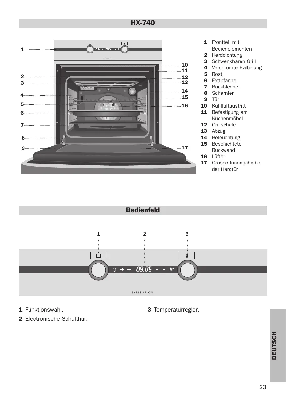 1 Frontteil mit Bedienelementen 2 Herddichtung 3 Schwenkbaren Grill 4 Verchromte Halterung 5 Rost 6 Fettpfanne 7 Backbleche 8 Scharnier 9 Tür 10 Kühlluftaustritt 11 Befestigung am Küchenmöbel 12 Grillschale 13 Abzug 14 Beleuchtung 15 Beschichtete Rückwand 16 Lüfter 17 Grosse Innenscheibe der Herdtür Bedienfeld