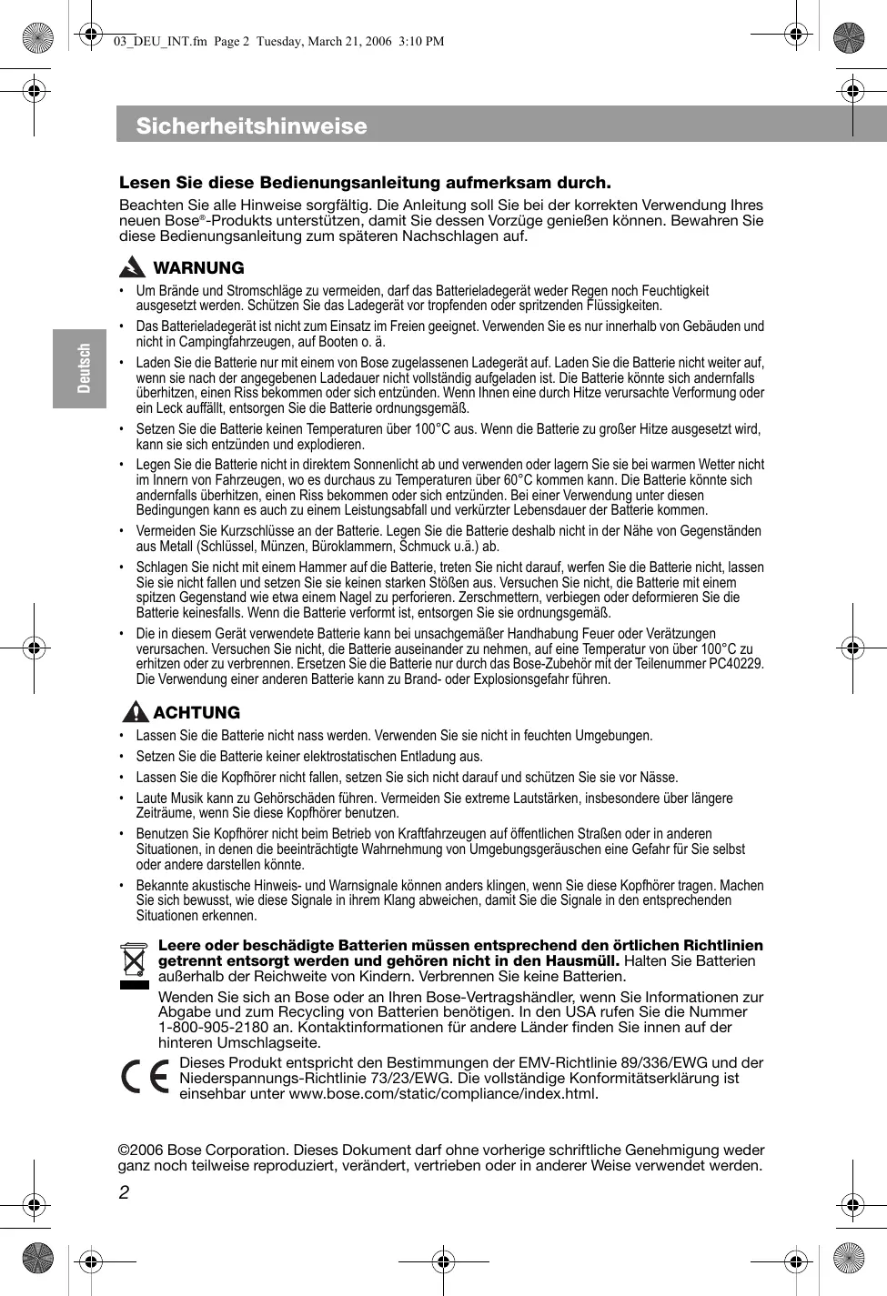 ©2006 Bose Corporation. Dieses Dokument darf ohne vorherige schriftliche Genehmigung weder ganz noch teilweise reproduziert, verändert, vertrieben oder in anderer Weise verwendet werden.