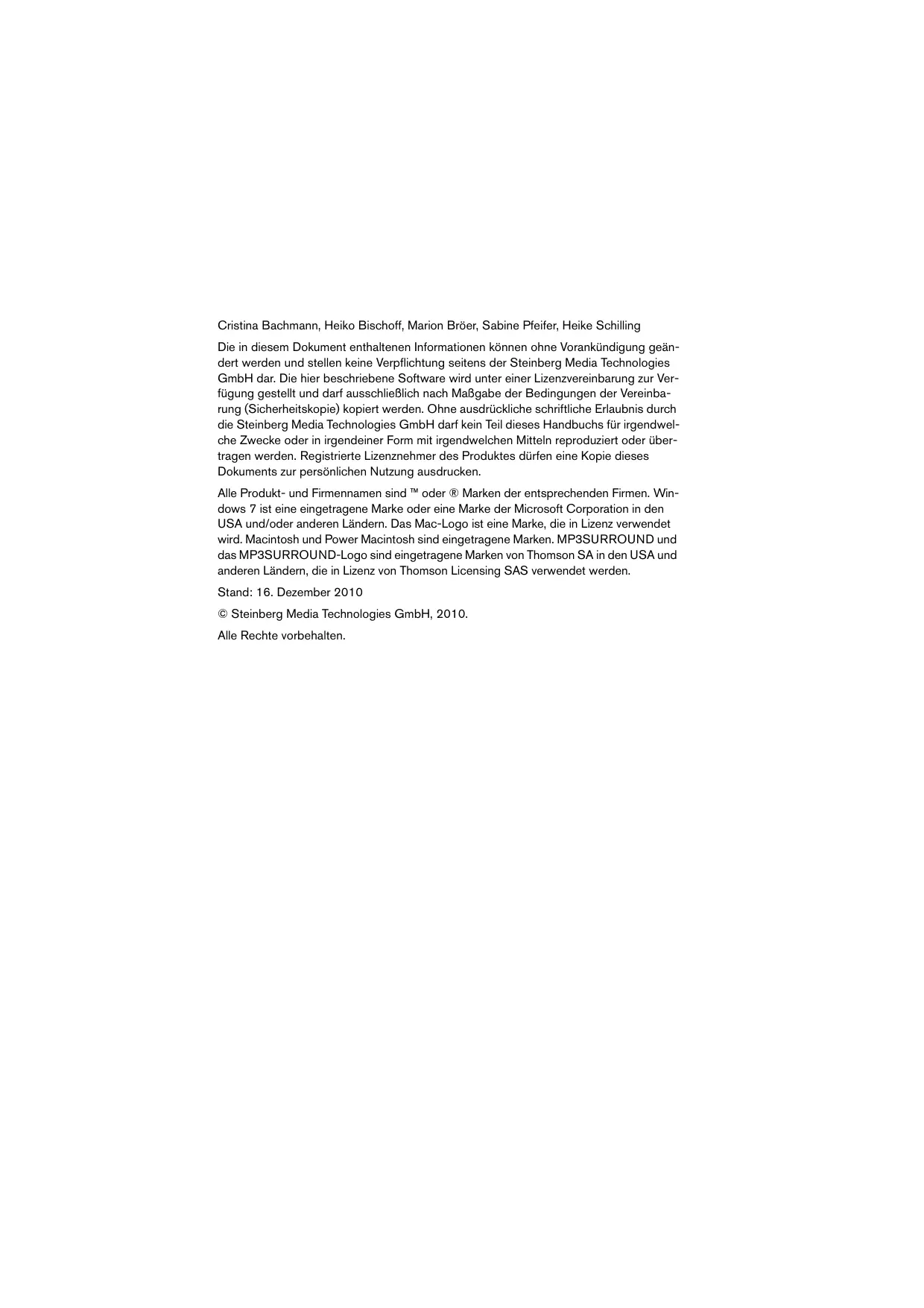 Schnelleinstieg Guide Rapide Guida Rapida DEUTSCH Deutsch Cristina Bachmann, Heiko Bischoff, Marion Bröer, Sabine Pfeifer, Heike Schilling Die in diesem Dokument enthaltenen Informationen können ohne Vorankündigung geändert werden und stellen keine Verpflichtung seitens der Steinberg Media Technologies GmbH dar. Die hier beschriebene Software wird unter einer Lizenzvereinbarung zur Verfügung gestellt und darf ausschließlich nach Maßgabe der Bedingungen der Vereinbarung (Sicherheitskopie) kopiert werden. Ohne ausdrückliche schriftliche Erlaubnis durch die Steinberg Media Technologies GmbH darf kein Teil dieses Handbuchs für irgendwelche Zwecke oder in irgendeiner Form mit irgendwelchen Mitteln reproduziert oder übertragen werden. Registrierte Lizenznehmer des Produktes dürfen eine Kopie dieses Dokuments zur persönlichen Nutzung ausdrucken. Alle Produkt- und Firmennamen sind ™ oder ® Marken der entsprechenden Firmen. Windows 7 ist eine eingetragene Marke oder eine Marke der Microsoft Corporation in den USA und/oder anderen Ländern. Das Mac-Logo ist eine Marke, die in Lizenz verwendet wird. Macintosh und Power Macintosh sind eingetragene Marken. MP3SURROUND und das MP3SURROUND-Logo sind eingetragene Marken von Thomson SA in den USA und anderen Ländern, die in Lizenz von Thomson Licensing SAS verwendet werden. Stand: 16. Dezember 2010 © Steinberg Media Technologies GmbH, 2010. Alle Rechte vorbehalten. DEUTSCH Inhaltsverzeichnis