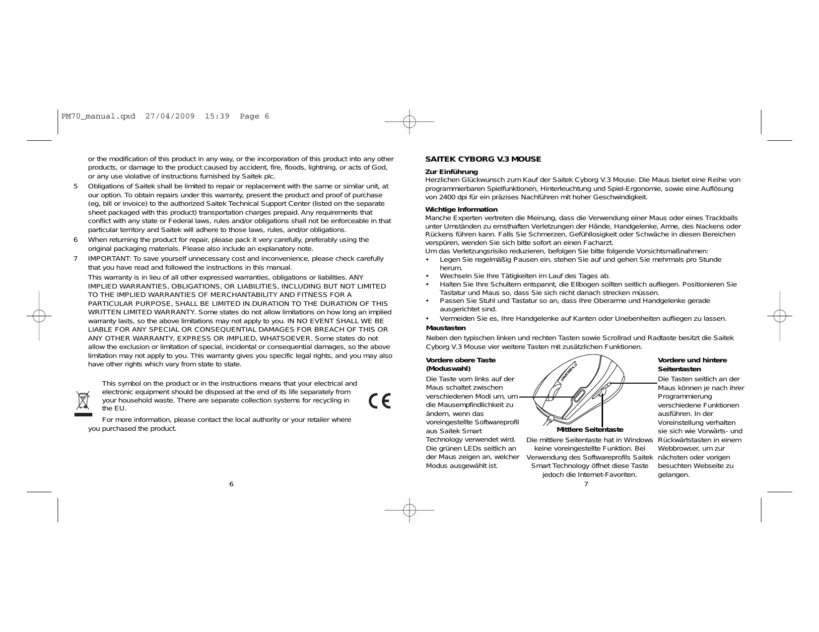 SAITEK CYBORG V.3 MOUSE Zur Einführung Herzlichen Glückwunsch zum Kauf der Saitek Cyborg V.3 Mouse. Die Maus bietet eine Reihe von programmierbaren Spielfunktionen, Hinterleuchtung und Spiel-Ergonomie, sowie eine Auflösung von 2400 dpi für ein präzises Nachführen mit hoher Geschwindigkeit. Wichtige Information Manche Experten vertreten die Meinung, dass die Verwendung einer Maus oder eines Trackballs unter Umständen zu ernsthaften Verletzungen der Hände, Handgelenke, Arme, des Nackens oder Rückens führen kann. Falls Sie Schmerzen, Gefühllosigkeit oder Schwäche in diesen Bereichen verspüren, wenden Sie sich bitte sofort an einen Facharzt. Um das Verletzungsrisiko reduzieren, befolgen Sie bitte folgende Vorsichtsmaßnahmen: • Legen Sie regelmäßig Pausen ein, stehen Sie auf und gehen Sie mehrmals pro Stunde herum. • Wechseln Sie Ihre Tätigkeiten im Lauf des Tages ab. • Halten Sie Ihre Schultern entspannt, die Ellbogen sollten seitlich aufliegen. Positionieren Sie Tastatur und Maus so, dass Sie sich nicht danach strecken müssen. • Passen Sie Stuhl und Tastatur so an, dass Ihre Oberarme und Handgelenke gerade ausgerichtet sind. • Vermeiden Sie es, Ihre Handgelenke auf Kanten oder Unebenheiten aufliegen zu lassen. Maustasten Neben den typischen linken und rechten Tasten sowie Scrollrad und Radtaste besitzt die Saitek Cyborg V.3 Mouse vier weitere Tasten mit zusätzlichen Funktionen. Vordere obere Taste (Moduswahl) Die Taste vorn links auf der Maus schaltet zwischen verschiedenen Modi um, um die Mausempfindlichkeit zu ändern, wenn das voreingestellte Softwareprofil Mittlere Seitentaste aus Saitek Smart Technology verwendet wird. Die mittlere Seitentaste hat in Windows Die grünen LEDs seitlich an keine voreingestellte Funktion. Bei der Maus zeigen an, welcher Verwendung des Softwareprofils Saitek Modus ausgewählt ist. Smart Technology öffnet diese Taste jedoch die Internet-Favoriten. 7