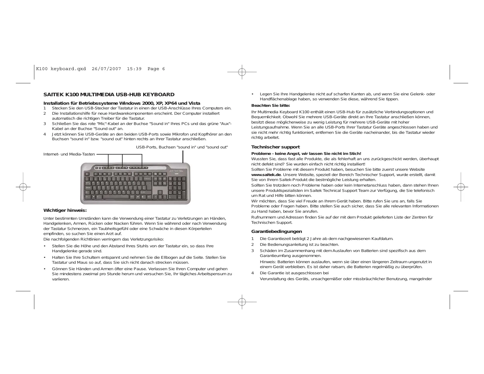 SAITEK K100 MULTIMEDIA USB-HUB KEYBOARD Installation für Betriebssysteme Windows 2000, XP, XP64 und Vista 1 2 3 4