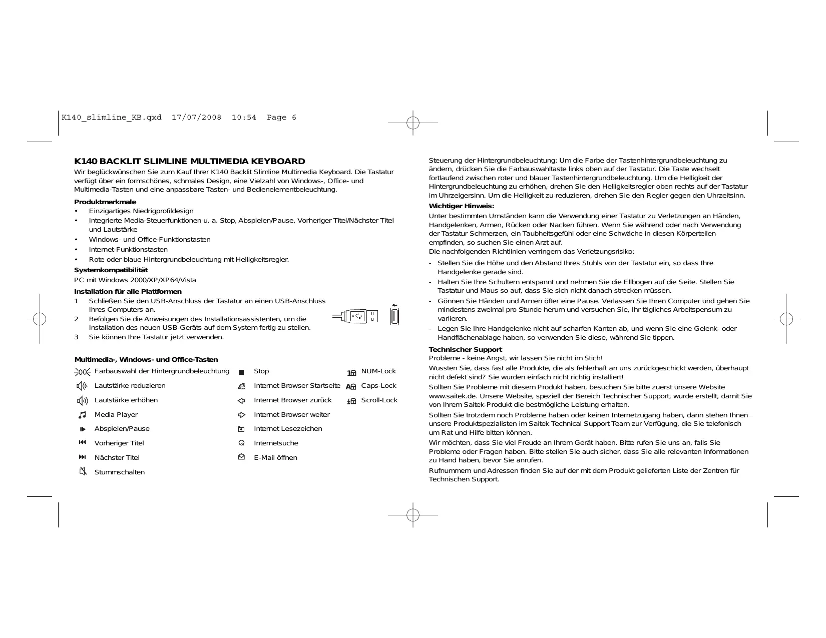 K140 BACKLIT SLIMLINE MULTIMEDIA KEYBOARD Wir beglückwünschen Sie zum Kauf Ihrer K140 Backlit Slimline Multimedia Keyboard. Die Tastatur verfügt über ein formschönes, schmales Design, eine Vielzahl von Windows-, Office- und Multimedia-Tasten und eine anpassbare Tasten- und Bedienelementbeleuchtung. Produktmerkmale • Einzigartiges Niedrigprofildesign • Integrierte Media-Steuerfunktionen u. a. Stop, Abspielen/Pause, Vorheriger Titel/Nächster Titel und Lautstärke • Windows- und Office-Funktionstasten • Internet-Funktionstasten • Rote oder blaue Hintergrundbeleuchtung mit Helligkeitsregler. Systemkompatibilität PC mit Windows 2000/XP/XP64/Vista Installation für alle Plattformen 1 Schließen Sie den USB-Anschluss der Tastatur an einen USB-Anschluss Ihres Computers an. 2 Befolgen Sie die Anweisungen des Installationsassistenten, um die Installation des neuen USB-Geräts auf dem System fertig zu stellen. 3 Sie können Ihre Tastatur jetzt verwenden.
