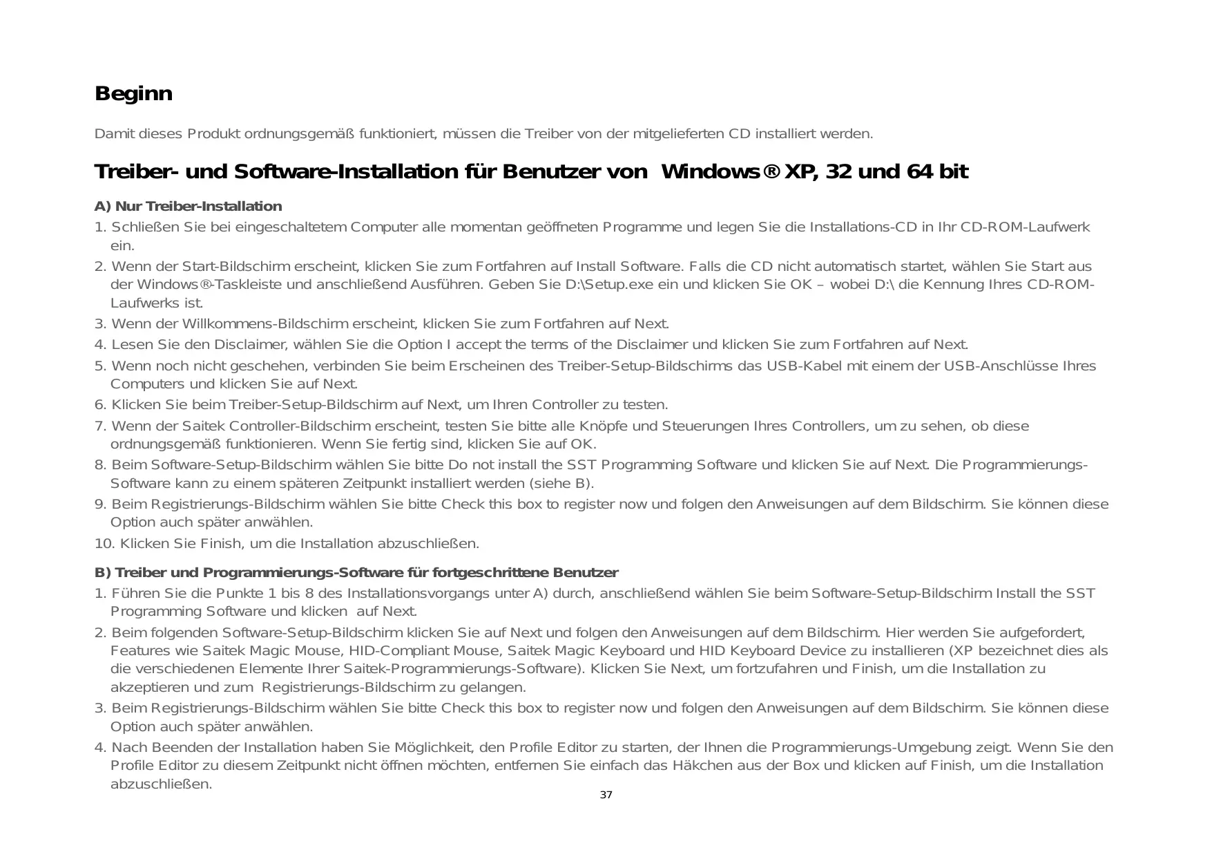 Treiber- und Software-Installation für Benutzer von Windows® XP, 32 und 64 bit A) Nur Treiber-Installation 1. Schließen Sie bei eingeschaltetem Computer alle momentan geöffneten Programme und legen Sie die Installations-CD in Ihr CD-ROM-Laufwerk ein. 2. Wenn der Start-Bildschirm erscheint, klicken Sie zum Fortfahren auf Install Software. Falls die CD nicht automatisch startet, wählen Sie Start aus der Windows®-Taskleiste und anschließend Ausführen. Geben Sie D:\Setup.exe ein und klicken Sie OK – wobei D:\ die Kennung Ihres CD-ROMLaufwerks ist. 3. Wenn der Willkommens-Bildschirm erscheint, klicken Sie zum Fortfahren auf Next. 4. Lesen Sie den Disclaimer, wählen Sie die Option I accept the terms of the Disclaimer und klicken Sie zum Fortfahren auf Next. 5. Wenn noch nicht geschehen, verbinden Sie beim Erscheinen des Treiber-Setup-Bildschirms das USB-Kabel mit einem der USB-Anschlüsse Ihres Computers und klicken Sie auf Next. 6. Klicken Sie beim Treiber-Setup-Bildschirm auf Next, um Ihren Controller zu testen. 7. Wenn der Saitek Controller-Bildschirm erscheint, testen Sie bitte alle Knöpfe und Steuerungen Ihres Controllers, um zu sehen, ob diese ordnungsgemäß funktionieren. Wenn Sie fertig sind, klicken Sie auf OK. 8. Beim Software-Setup-Bildschirm wählen Sie bitte Do not install the SST Programming Software und klicken Sie auf Next. Die ProgrammierungsSoftware kann zu einem späteren Zeitpunkt installiert werden (siehe B). 9. Beim Registrierungs-Bildschirm wählen Sie bitte Check this box to register now und folgen den Anweisungen auf dem Bildschirm. Sie können diese Option auch später anwählen. 10. Klicken Sie Finish, um die Installation abzuschließen. B) Treiber und Programmierungs-Software für fortgeschrittene Benutzer 1. Führen Sie die Punkte 1 bis 8 des Installationsvorgangs unter A) durch, anschließend wählen Sie beim Software-Setup-Bildschirm Install the SST Programming Software und klicken auf Next. 2. Beim folgenden Software-Setup-Bildschirm klicken Sie auf Next und folgen den Anweisungen auf dem Bildschirm. Hier werden Sie aufgefordert, Features wie Saitek Magic Mouse, HID-Compliant Mouse, Saitek Magic Keyboard und HID Keyboard Device zu installieren (XP bezeichnet dies als die verschiedenen Elemente Ihrer Saitek-Programmierungs-Software). Klicken Sie Next, um fortzufahren und Finish, um die Installation zu akzeptieren und zum Registrierungs-Bildschirm zu gelangen. 3. Beim Registrierungs-Bildschirm wählen Sie bitte Check this box to register now und folgen den Anweisungen auf dem Bildschirm. Sie können diese Option auch später anwählen. 4. Nach Beenden der Installation haben Sie Möglichkeit, den Profile Editor zu starten, der Ihnen die Programmierungs-Umgebung zeigt. Wenn Sie den Profile Editor zu diesem Zeitpunkt nicht öffnen möchten, entfernen Sie einfach das Häkchen aus der Box und klicken auf Finish, um die Installation abzuschließen. 37