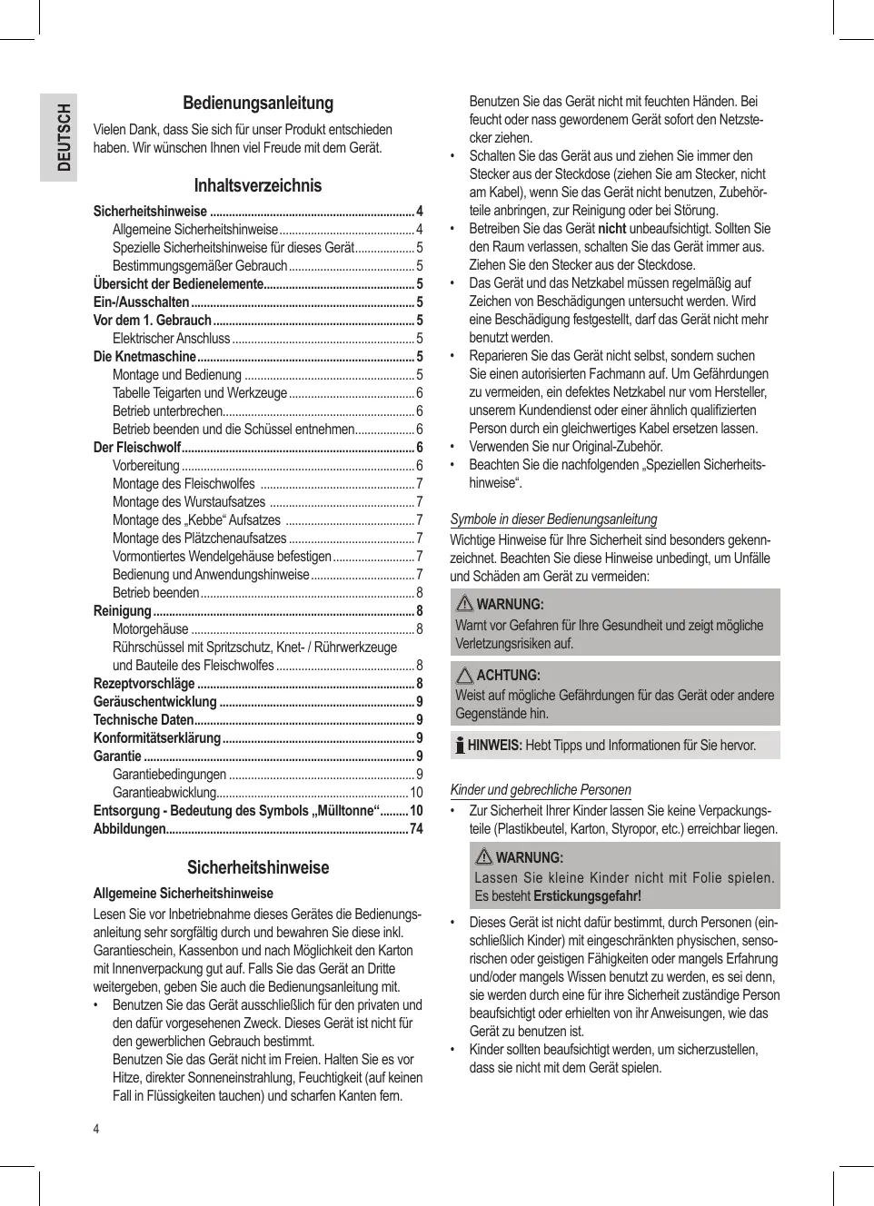- Kurzzeitbetrieb: Betreiben Sie das Gerät mit schweren Teigen nicht länger als 10 Minuten und lassen das Gerät dann 10 Minuten abkühlen. Betrieb unterbrechen Warnung: Verletzungsgefahr!