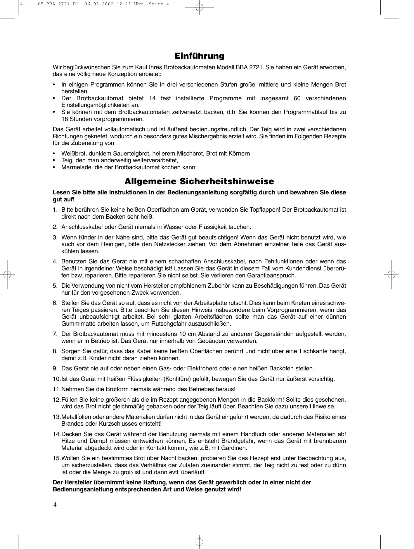 Allgemeine Sicherheitshinweise Lesen Sie bitte alle Instruktionen in der Bedienungsanleitung sorgfältig durch und bewahren Sie diese gut auf! 1. Bitte berühren Sie keine heißen Oberflächen am Gerät, verwenden Sie Topflappen! Der Brotbackautomat ist direkt nach dem Backen sehr heiß. 2. Anschlusskabel oder Gerät niemals in Wasser oder Flüssigkeit tauchen. 3. Wenn Kinder in der Nähe sind, bitte das Gerät gut beaufsichtigen! Wenn das Gerät nicht benutzt wird, wie auch vor dem Reinigen, bitte den Netzstecker ziehen. Vor dem Abnehmen einzelner Teile das Gerät auskühlen lassen. 4. Benutzen Sie das Gerät nie mit einem schadhaften Anschlusskabel, nach Fehlfunktionen oder wenn das Gerät in irgendeiner Weise beschädigt ist! Lassen Sie das Gerät in diesem Fall vom Kundendienst überprüfen bzw. reparieren. Bitte reparieren Sie nicht selbst. Sie verlieren den Garantieanspruch. 5. Die Verwendung von nicht vom Hersteller empfohlenem Zubehör kann zu Beschädigungen führen. Das Gerät nur für den vorgesehenen Zweck verwenden. 6. Stellen Sie das Gerät so auf, dass es nicht von der Arbeitsplatte rutscht. Dies kann beim Kneten eines schweren Teiges passieren. Bitte beachten Sie diesen Hinweis insbesondere beim Vorprogrammieren, wenn das Gerät unbeaufsichtigt arbeitet. Bei sehr glatten Arbeitsflächen sollte man das Gerät auf einer dünnen Gummimatte arbeiten lassen, um Rutschgefahr auszuschließen. 7. Der Brotbackautomat muss mit mindestens 10 cm Abstand zu anderen Gegenständen aufgestellt werden, wenn er in Betrieb ist. Das Gerät nur innerhalb von Gebäuden verwenden. 8. Sorgen Sie dafür, dass das Kabel keine heißen Oberflächen berührt und nicht über eine Tischkante hängt, damit z.B. Kinder nicht daran ziehen können. 9. Das Gerät nie auf oder neben einen Gas- oder Elektroherd oder einen heißen Backofen stellen. 10.Ist das Gerät mit heißen Flüssigkeiten (Konfitüre) gefüllt, bewegen Sie das Gerät nur äußerst vorsichtig. 11.Nehmen Sie die Brotform niemals während des Betriebes heraus! 12.Füllen Sie keine größeren als die im Rezept angegebenen Mengen in die Backform! Sollte dies geschehen, wird das Brot nicht gleichmäßig gebacken oder der Teig läuft über. Beachten Sie dazu unsere Hinweise. 13.Metallfolien oder andere Materialien dürfen nicht in das Gerät eingeführt werden, da dadurch das Risiko eines Brandes oder Kurzschlusses entsteht! 14.Decken Sie das Gerät während der Benutzung niemals mit einem Handtuch oder anderen Materialien ab! Hitze und Dampf müssen entweichen können. Es entsteht Brandgefahr, wenn das Gerät mit brennbarem Material abgedeckt wird oder in Kontakt kommt, wie z.B. mit Gardinen. 15.Wollen Sie ein bestimmtes Brot über Nacht backen, probieren Sie das Rezept erst unter Beobachtung aus, um sicherzustellen, dass das Verhältnis der Zutaten zueinander stimmt, der Teig nicht zu fest oder zu dünn ist oder die Menge zu groß ist und dann evtl. überläuft. Der Hersteller übernimmt keine Haftung, wenn das Gerät gewerblich oder in einer nicht der Bedienungsanleitung entsprechenden Art und Weise genutzt wird! 4