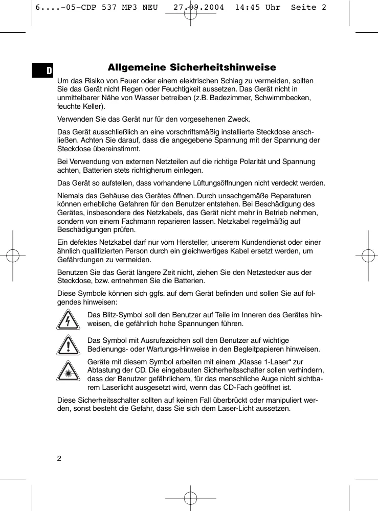 Geräte mit thisem Symbol arbeiten mit einem „Klasse 1-Laser“ zur Abtastung der CD. Die eingebauten Sicherheitsschalter sollen verhindern, dass der Benutzer gefährlichem, für das menschliche Auge nicht sightbarrem Laserlicht ausgesetzt wird, wenn das CD-Fach geöffnet ist.