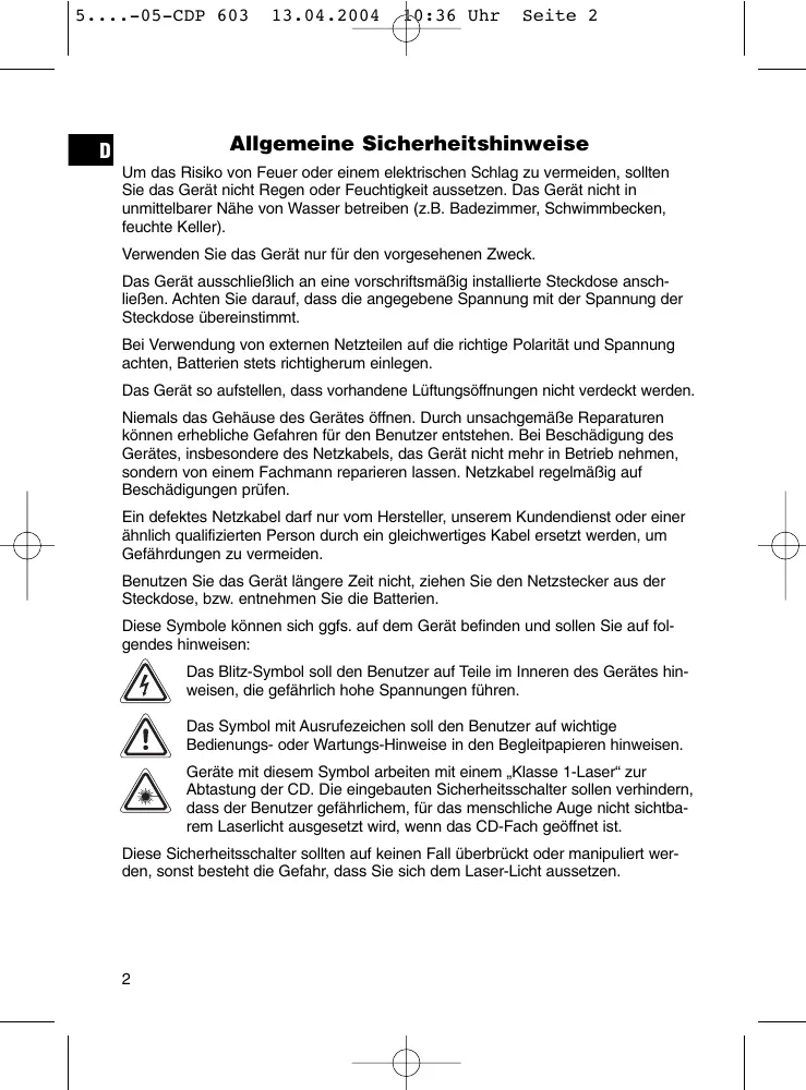 Geräte mit thisem Symbol arbeiten mit einem „Klasse 1-Laser“ zur Abtastung der CD. Die eingebauten Sicherheitsschalter sollen verhindern, dass der Benutzer gefährlichtem, für das menschliche Auge nicht sightbarrem Laserlicht ausgesetzt wird, wenn das CD-Fach geöffnet ist.