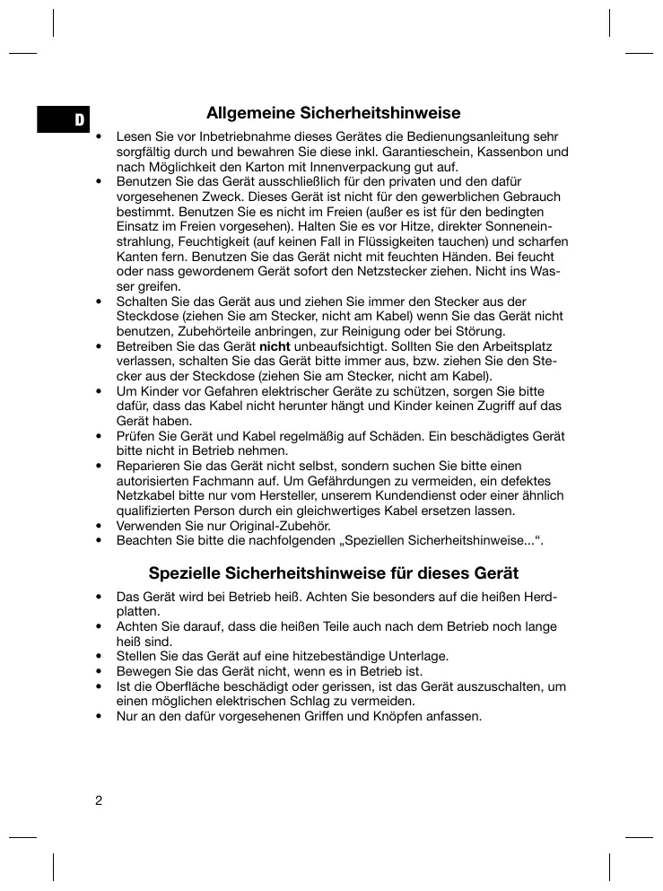 N’utilisez cet appareil que pour un usage privé et pour les taches auxquelles il est destiné. Cet appareil n’est pas prévu pour une utilisation professionnelle. Ne l’utilisez pas en plein air (sauf s’il est indiqué que vous pouvez le faire). Protégez-le de la chaleur, des rayons directs du soleil, de l’humidité (ne le plongez en aucun cas dans l’eau) et des objets tranchants. N’utilisez pas cet appareil avec des mains humides. S’il arrive que de l’humidité ou de l’eau atteignent l’appareil, débranchez aussitôt le câble d’alimentation. Ne touchez pas les parties mouillées. Arrêtez l’appareil et débranchez toujours le câble d’alimentation de la prise de courant (tirez sur la fiche, pas sur le câble) si vous n’utilisez pas l’appareil, si vous installez les accessoires, pour le nettoyage ou en cas de panne. Ne laissez jamais fonctionner l’appareil sans surveillance. Arrêtez toujours l’appareil ou débranchez le câble d’alimentation (en tirant sur la fiche et non pas sur le câble) si vous devez vous absenter. Pour protéger les enfants des risques engendrés par les appareils électriques , veillez à ce que le câble ne pende pas de l’appareil et que l’appareil ne soit pas à portée des enfants. Contrôlez régulièrement l’appareil et le câble. Ne mettez pas l’appareil en marche s’il est endommagé. Ne réparez pas l’appareil vous-même. Contactez plutôt un technicien qualifié. Pour éviter toute mise en danger, ne faites remplacer le câble défectueux que par un câble équivalent et que par le fabricant, notre service après-vente ou toute personne de qualification similaire. N’utilisez que les accessoires d’origine. Respectez les „conseils de sécurité spécifiques à cet appareil“ ci-dessous ...