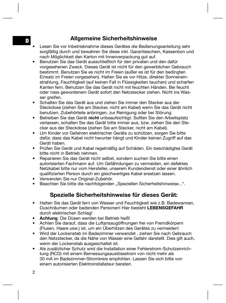 - Halten Sie das Gerät fern von Wasser und Feuchtigkeit wie z.B. Badewannen, Duschräumen oder badenden Personen! Hier besteht LEBENSGEFAHR durch elektrischen Schlag!