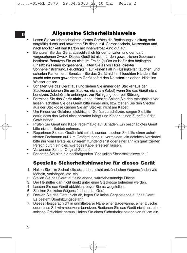 - Der Heizlufter darf nicht direkt unter einer Steckdose betrieben werden.