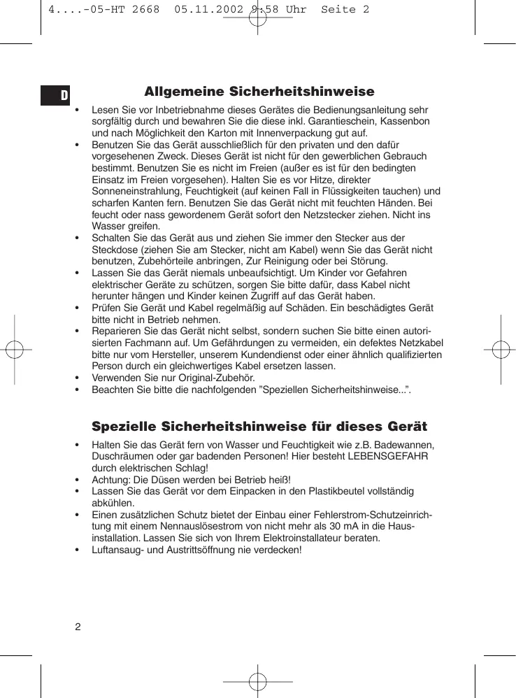 - Benutzen Sie das Gerät ausschließlich für den privaten und den damit vorgesehenen Zweck. Diese Gerät ist nicht für den gewerblichen Gebrauch bestimmt. Benutzen Sie es nicht im Freien (außer es ist für den bedingten Einsatz im Freien vorgesehen). Halten Sie es vor Hitze, direkter Sonneneinstrahlung, Feuchtigkeit (auf keinen Fall in Flüssigkeiten tauchen) und scharfen Kanten fern. Benutzen Sie das Gerät nicht mit feuchten Handen. Bei feucht oder nass gewordenem Gerät sofort den Netzsteckerziehen. Nicht ins Wasser greifen.