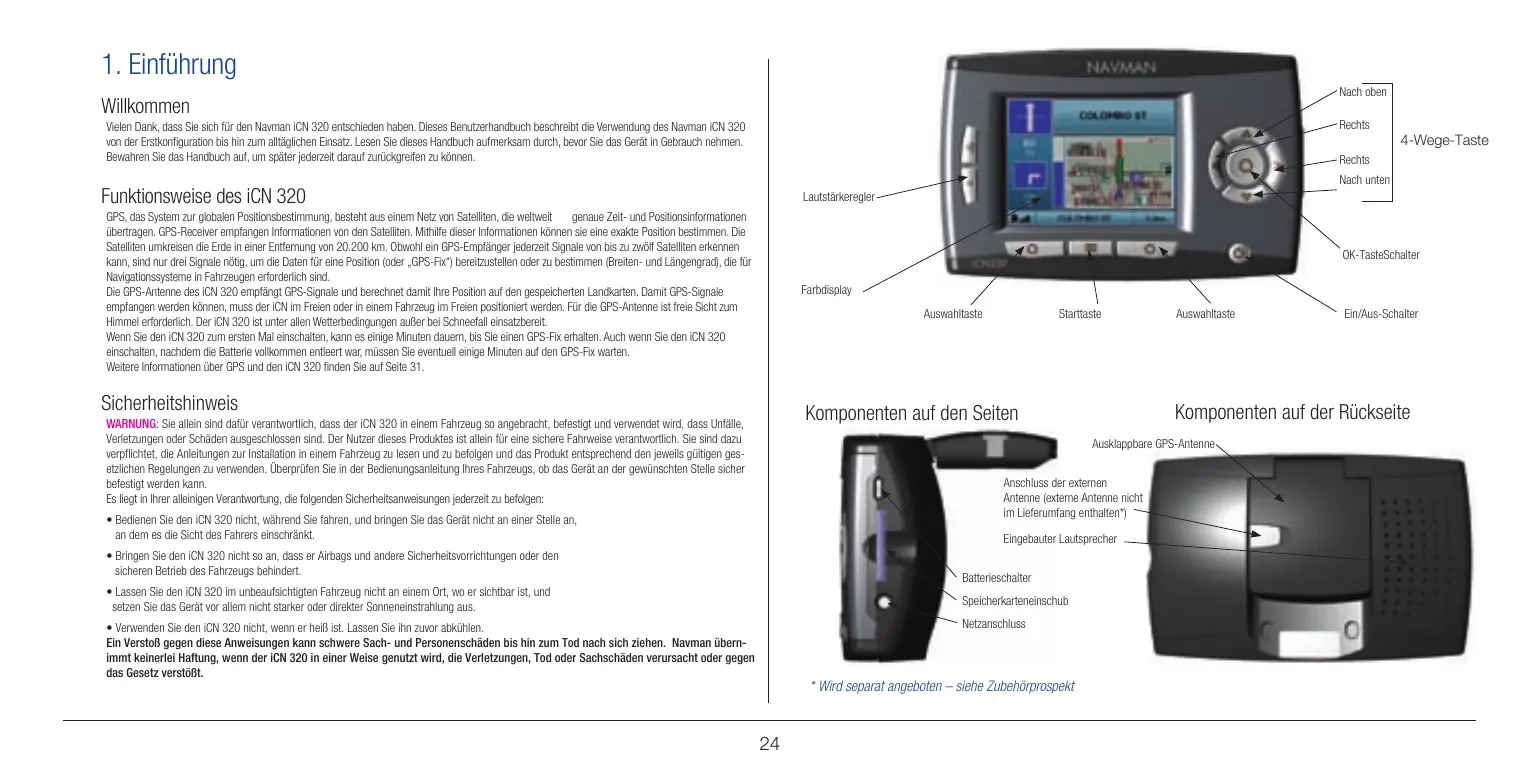 Ein/Aus-Schalter Komponenten auf der Rückseite Komponenten auf den Seiten WARNUNG: Sie allein sind dafür verantwortlich, dass der iCN 320 in einem Fahrzeug so angebracht, befestigt und verwendet wird, dass Unfälle, Verletzungen oder Schäden ausgeschlossen sind. Der Nutzer dieses Produktes ist allein für eine sichere Fahrweise verantwortlich. Sie sind dazu verpflichtet, die Anleitungen zur Installation in einem Fahrzeug zu lesen und zu befolgen und das Produkt entsprechend den jeweils gültigen gesetzlichen Regelungen zu verwenden. Überprüfen Sie in der Bedienungsanleitung Ihres Fahrzeugs, ob das Gerät an der gewünschten Stelle sicher befestigt werden kann. Es liegt in Ihrer alleinigen Verantwortung, die folgenden Sicherheitsanweisungen jederzeit zu befolgen: Auswahltaste