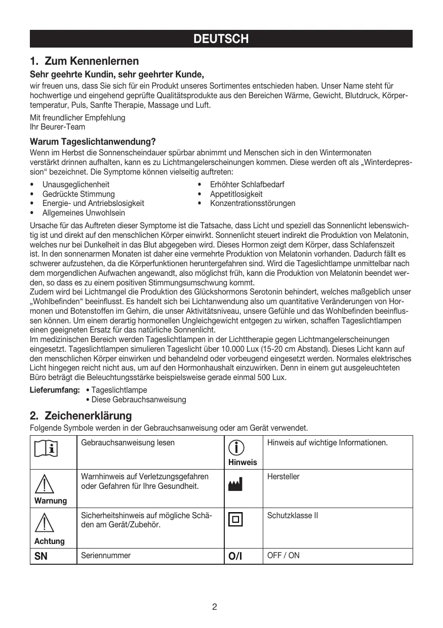 Deutsch 1. Zum Kennenlernen Sehr geehrte Kundin, sehr geehrter Kunde, wir freuen uns, dass Sie sich für ein Produkt unseres Sortimentes entschieden haben. Unser Name steht für hochwertige und eingehend geprüfte Qualitätsprodukte aus den Bereichen Wärme, Gewicht, Blutdruck, Körpertemperatur, Puls, Sanfte Therapie, Massage und Luft. Mit freundlicher Empfehlung Ihr Beurer-Team