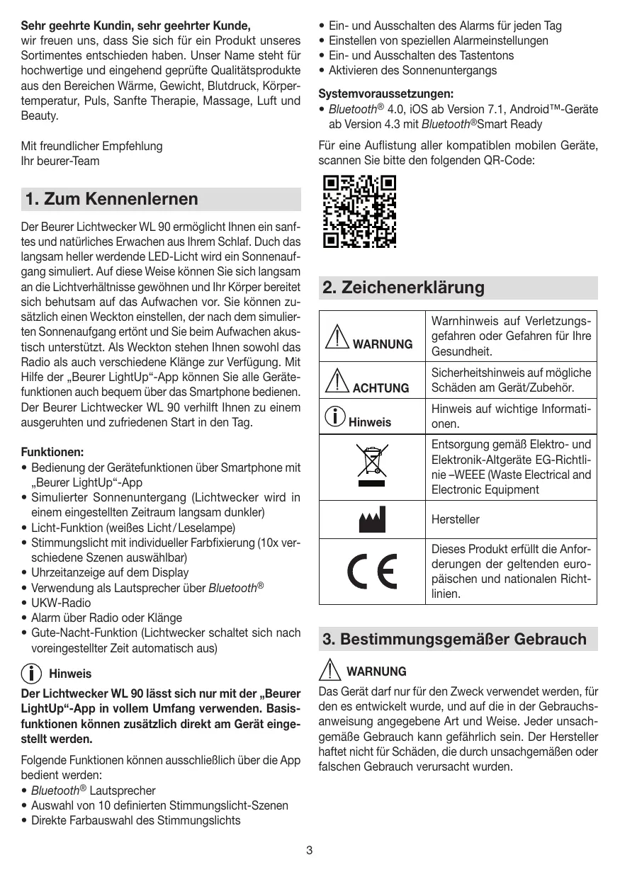 Table des matières 1. Familiarisation avec l'appareil 17 2. Symboles utilisés 17 3. Utilisation conforme aux recommandations 17 4. Consignes de sécurité 18 5. Description de l'appareil 18 6. Mise en service de l'appareil 19 7. Mise en service de l'application 19 7.1 Application Beurer LightUp 19 7.2 Haut-parleur Bluetooth® 19 7.3 Fonction coucher de soleil 20 8. Utilisation de l'appareil 20 8.1 Régler l'heure et la date 20 8.2 Activer/désactiver l'alarme 20 8.3 Réglage de l'heure de l'alarme 20 8.4 Désactivation de l'alarme 21 8.5 Réglage de la luminosité de l'écran 21 8.6 Mode radio 21 8.7 Fonction bonne nuit (radio sleep timer) 21 8.8 Fonction lumière 21 • Activation ou désactivation du bip des touches • Activation du coucher de soleil Configuration requise : • Bluetooth® 4.0, iOS à partir de la version 7.1, appareils Android™ à partir de la version 4.3 avec Bluetooth® Smart Ready Pour obtenir la liste des appareils mobiles compatibles, veuillez scanner le code QR suivant :