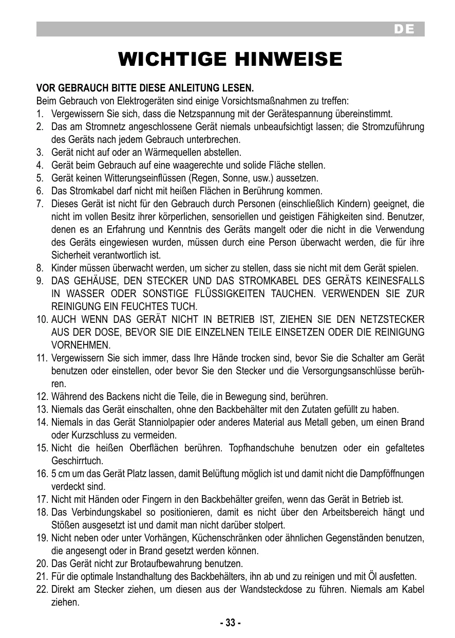 17. Nicht mit Händen oder Fingern in den Backbehälter greifen, wenn das Gerät in Betrieb ist.