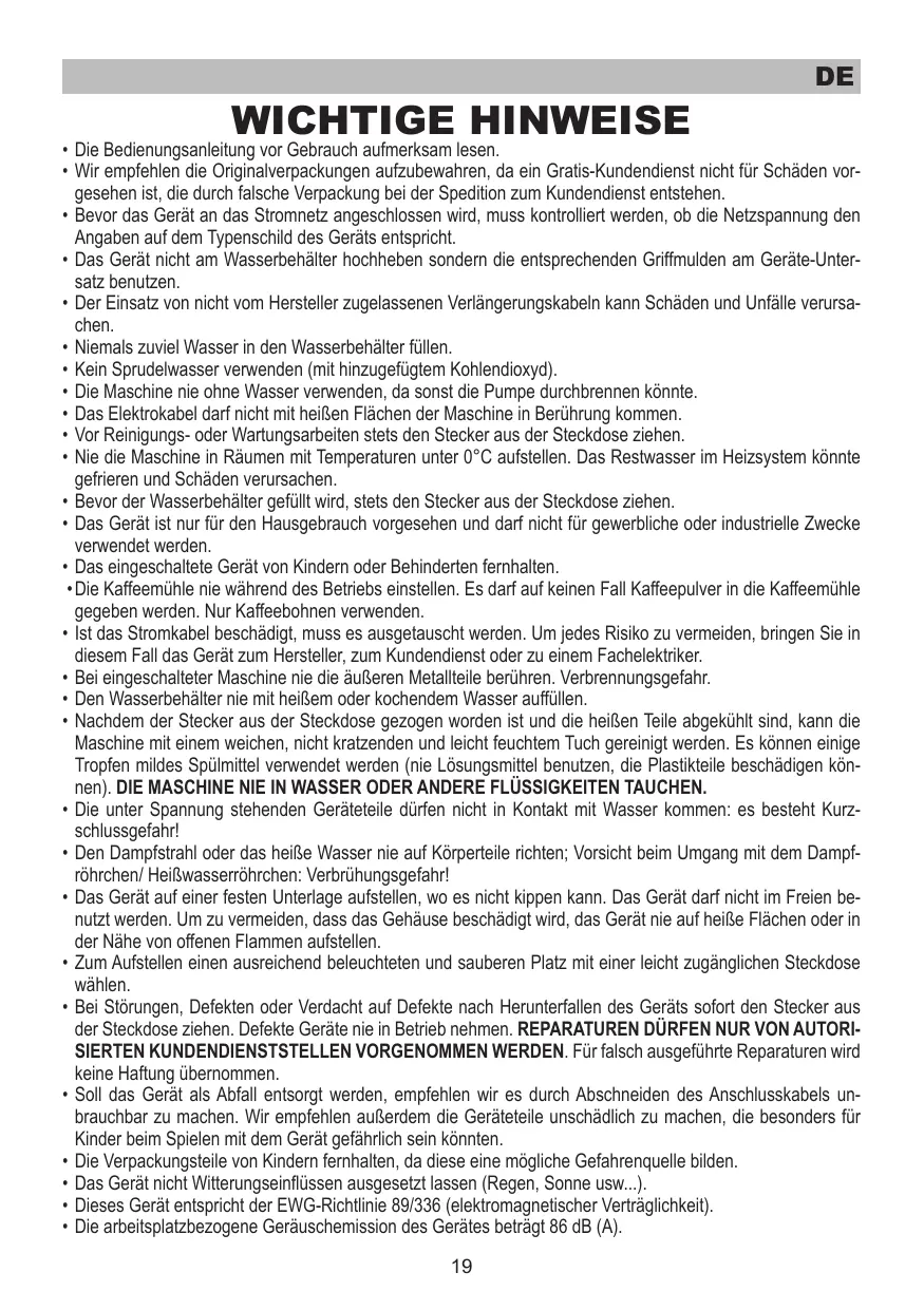 - Die Maschine nie ohne Wasser verwenden, da sonst die Pumpe durchbrennen könnte.