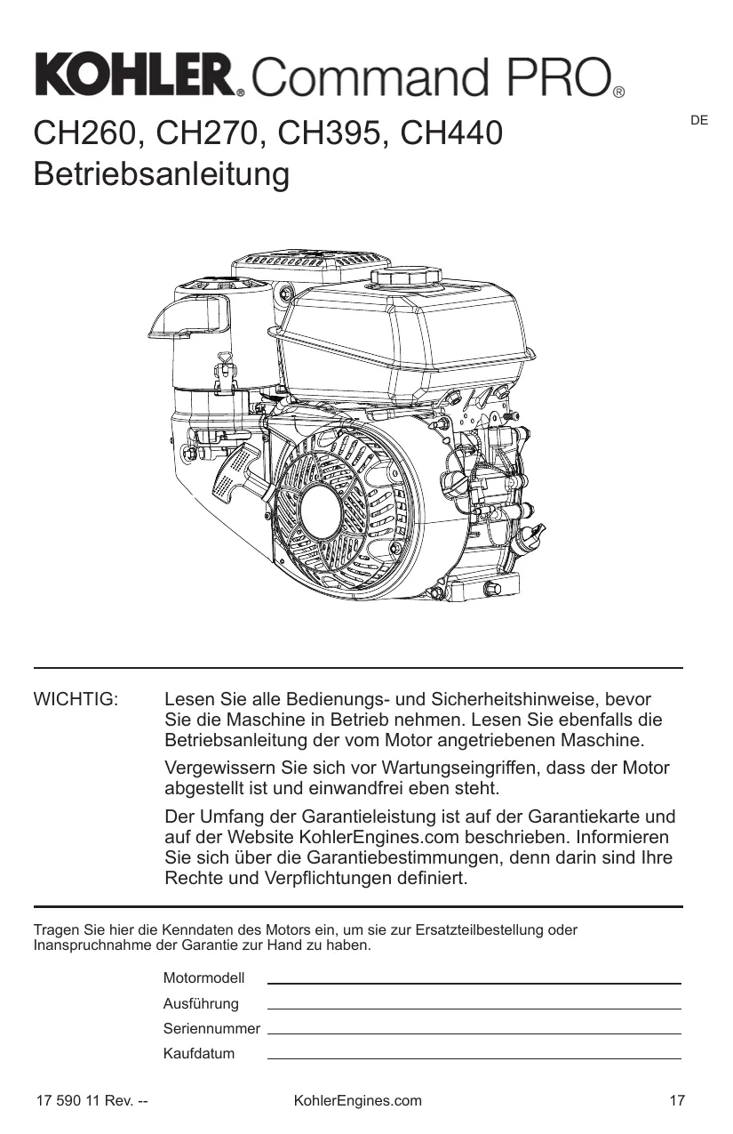 CH260, CH270, CH395, CH440 Betriebsanleitung WICHTIG: Lesen Sie alle Bedienungs- und Sicherheitshinweise, bevor Sie die Maschine in Betrieb nehmen. Lesen Sie ebenfalls die Betriebsanleitung der vom Motor angetriebenen Maschine. Vergewissern Sie sich vor Wartungseingriffen, dass der Motor abgestellt ist und einwandfrei eben steht. Der Umfang der Garantieleistung ist auf der Garantiekarte und auf der Website KohlerEngines.com beschrieben. Informieren Sie sich über die Garantiebestimmungen, denn darin sind Ihre Rechte und Verpflichtungen definiert. Tragen Sie hier die Kenndaten des Motors ein, um sie zur Ersatzteilbestellung oder Inanspruchnahme der Garantie zur Hand zu haben. Motormodell Ausführung Seriennummer Kaufdatum 17 590 11 Rev. -- KohlerEngines.com