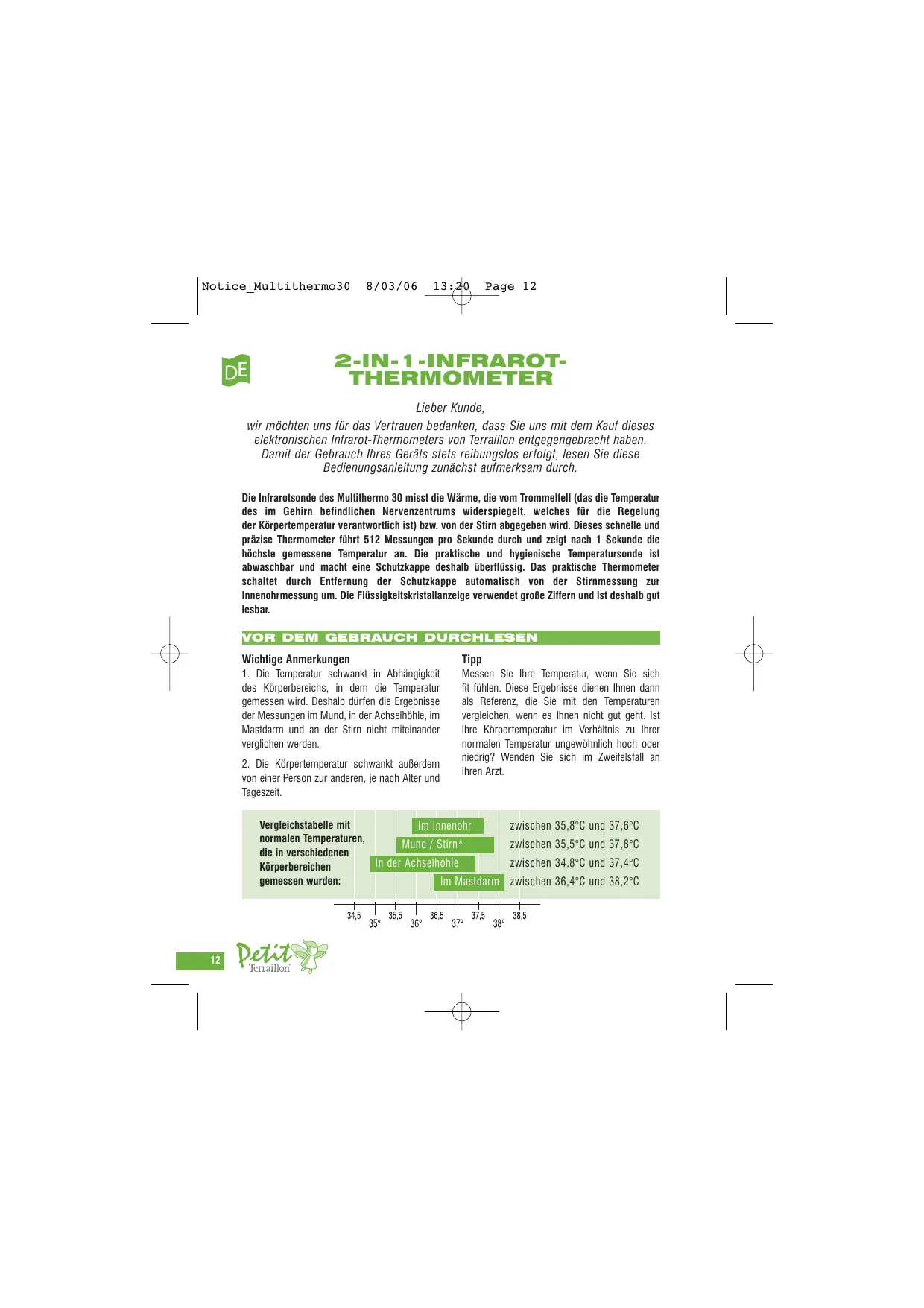 Laden Sie die Anleitung für Ihr Thermometer kostenlos im PDF-Format! Finden Sie Ihr Handbuch MULTITHERMO 30 - TERRAILLON und nehmen Sie Ihr elektronisches Gerät wieder in die Hand. Auf dieser Seite sind alle Dokumente veröffentlicht, die für die Verwendung Ihres Geräts notwendig sind. MULTITHERMO 30 von der Marke TERRAILLON.