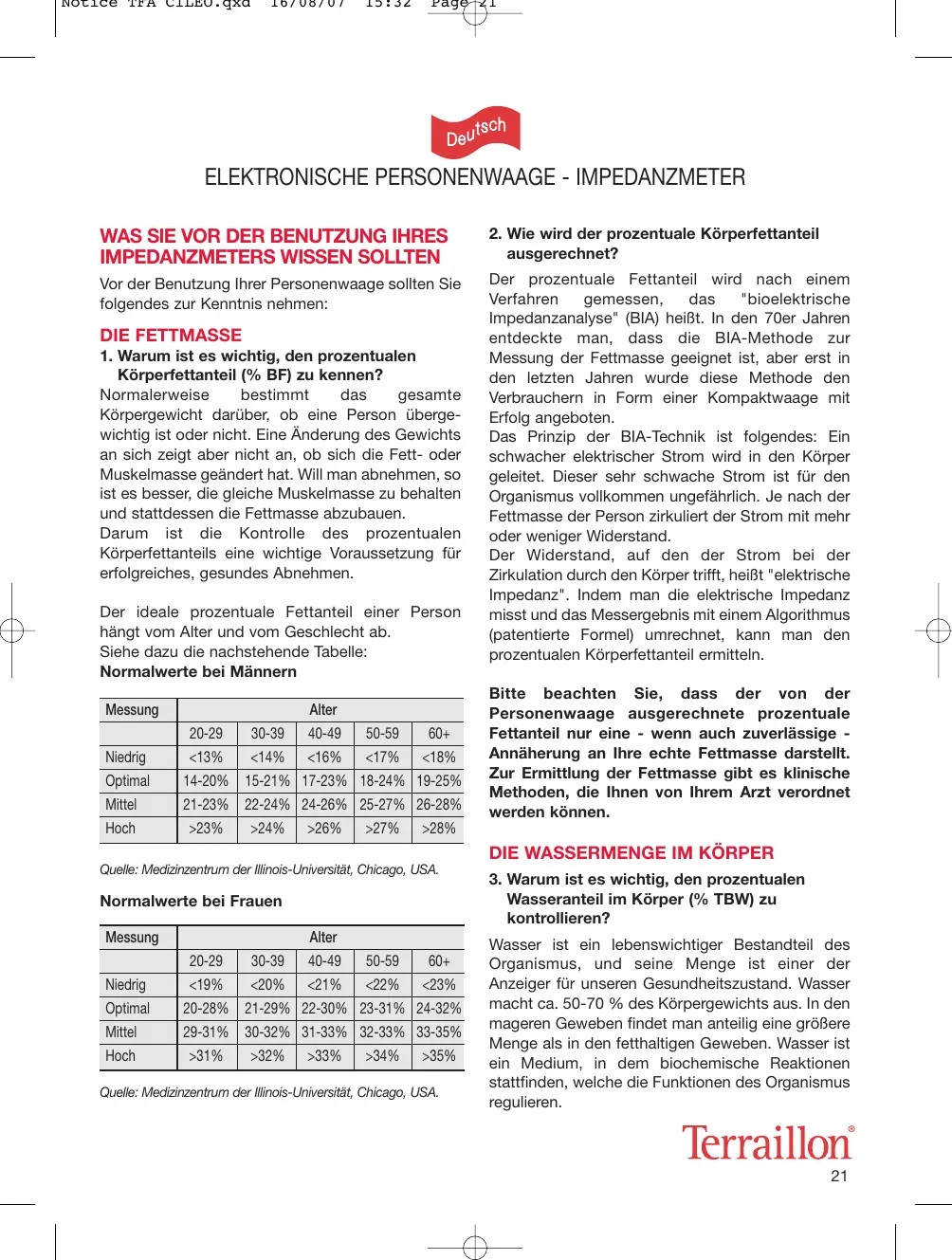 De Terraillon personenweegschaal met lichaamsvetmeter is ontwikkeld en vervaardigd in een fabriek met ISO 9001 en ISO 14001 certificering en voldoet aan de geldende normen inzake kwaliteit en milieu. De weegschaal gebruikt de methode van Bioelektrische Impedantie Analyse (BIA) om het percentage lichaamsvet en water in het lichaam te berekenen. Het toestel stuurt een onschadelijke hoeveelheid stroom door het lichaam en raamt, na meting van de impedantie van het lichaam, het percentage water en lichaamsvet. Deze weegschaal heeft bovendien een “Atleet” modus, omdat het lichaam van atleten anders is opgebouwd dan dat van niet-atleten.