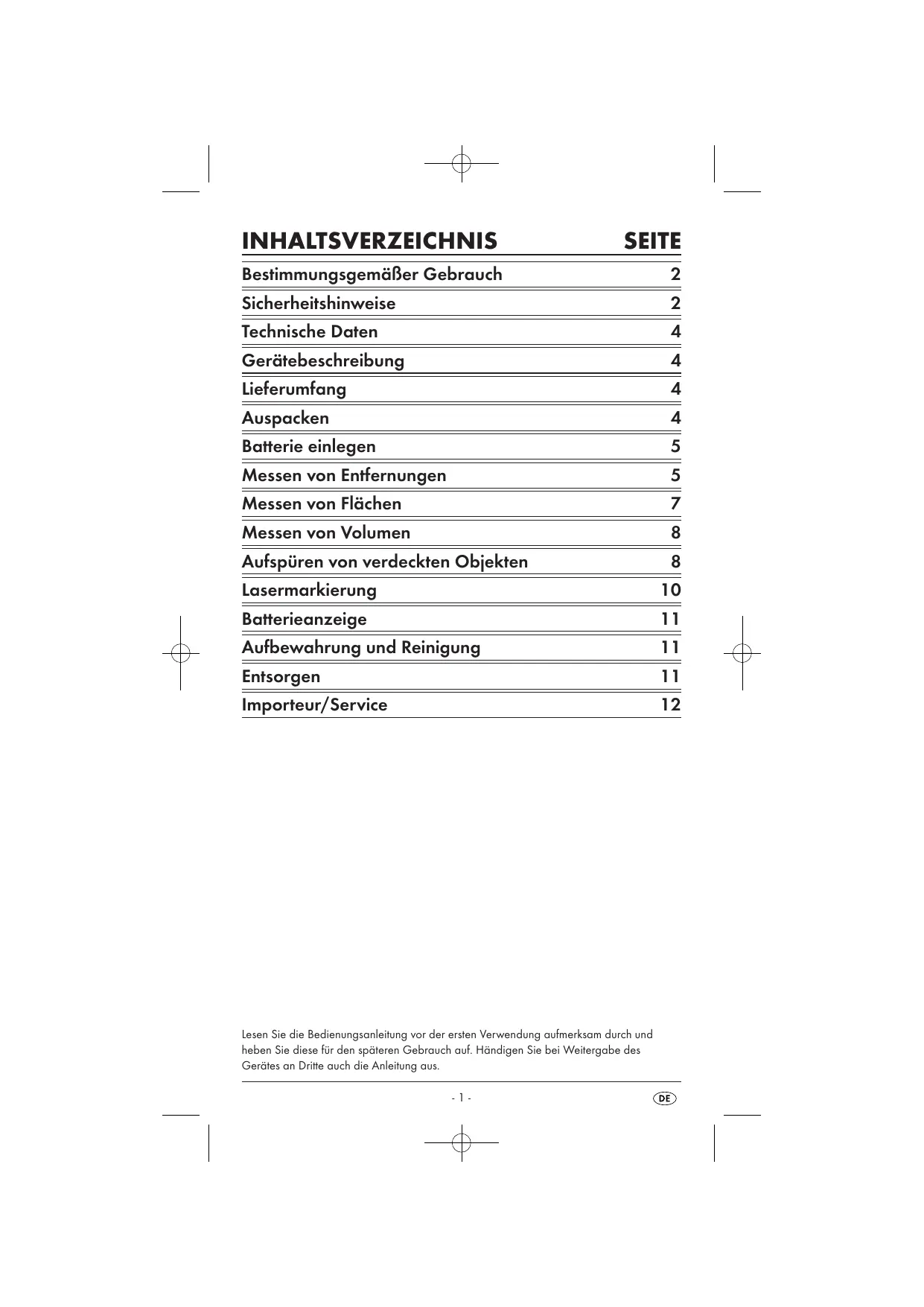 Der Multidetektor mit Laser ist zur Ortung von elektrischen Leitungen, von Metall- und Holzobjekten, zum Projizieren von Laserlinien, zum Berechnen von Flächen und Volumina, sowie zum Messen von Entfernungen konzipiert. Dieses Gerät ist nur für private Zwecke bestimmt. Gebrauchen Sie es nicht gewerblich. Eine andere oder darüber hinausgehende Benutzung gilt als nicht bestimmungsgemäß und kann zu Beschädigungen und Verletzungen führen. Für Schäden durch Manipulation an der Lasereinrichtung, sowie am Ultraschallsender/-empfänger und bei Nichtbefolgen der Sicherheitshinweise wird keine Haftung übernommen.