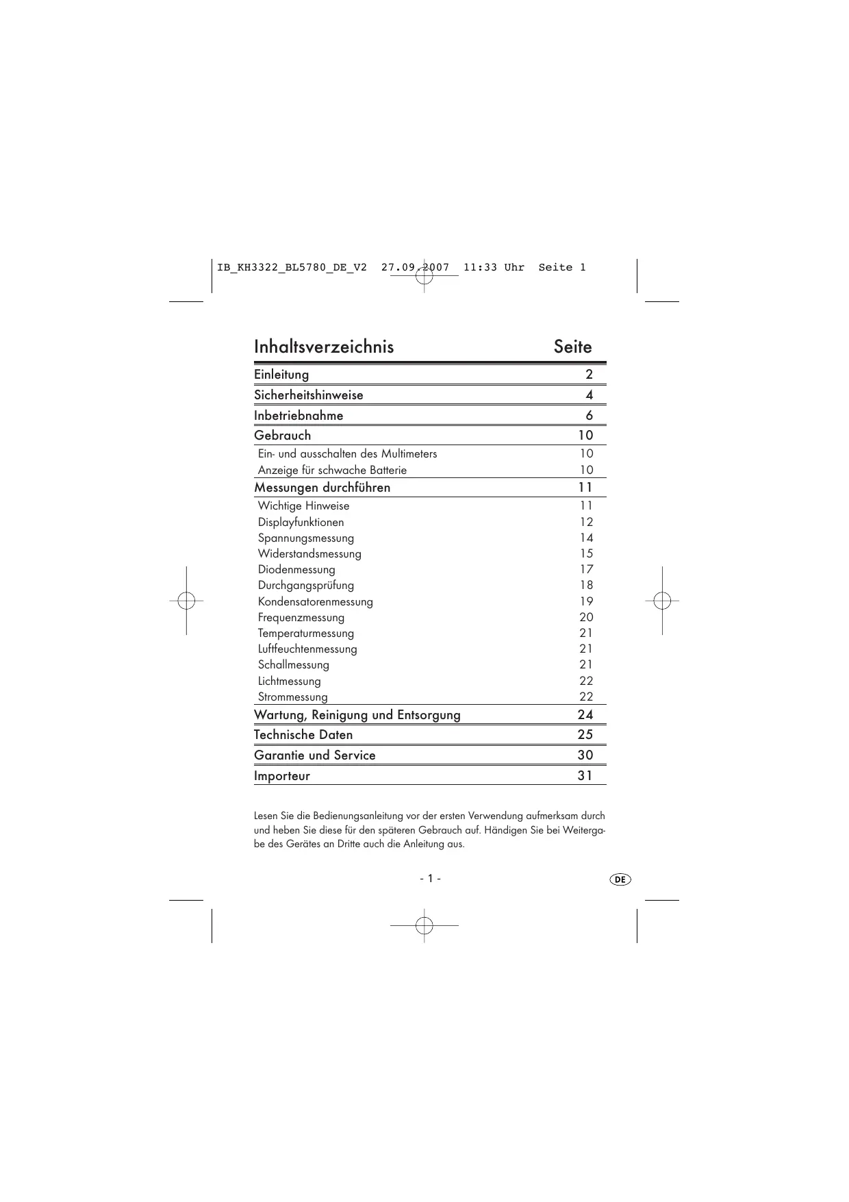 Laden Sie die Anleitung für Ihr Multimeter kostenlos im PDF-Format! Finden Sie Ihr Handbuch KH 3322 - POWERFIX und nehmen Sie Ihr elektronisches Gerät wieder in die Hand. Auf dieser Seite sind alle Dokumente veröffentlicht, die für die Verwendung Ihres Geräts notwendig sind. KH 3322 von der Marke POWERFIX.