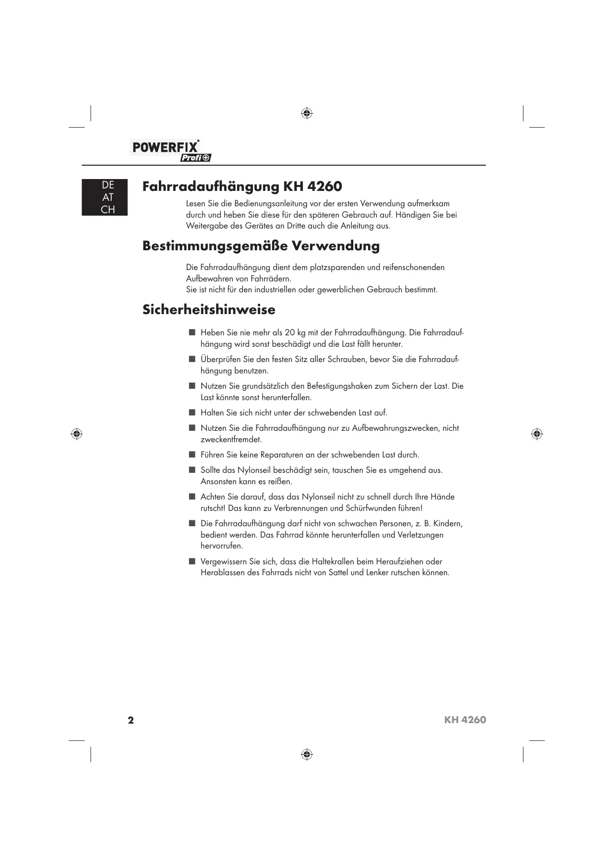 DE AT CH Fahrradaufhängung KH 4260 Lesen Sie die Bedienungsanleitung vor der ersten Verwendung aufmerksam durch und heben Sie diese für den späteren Gebrauch auf. Händigen Sie bei Weitergabe des Gerätes an Dritte auch die Anleitung aus.