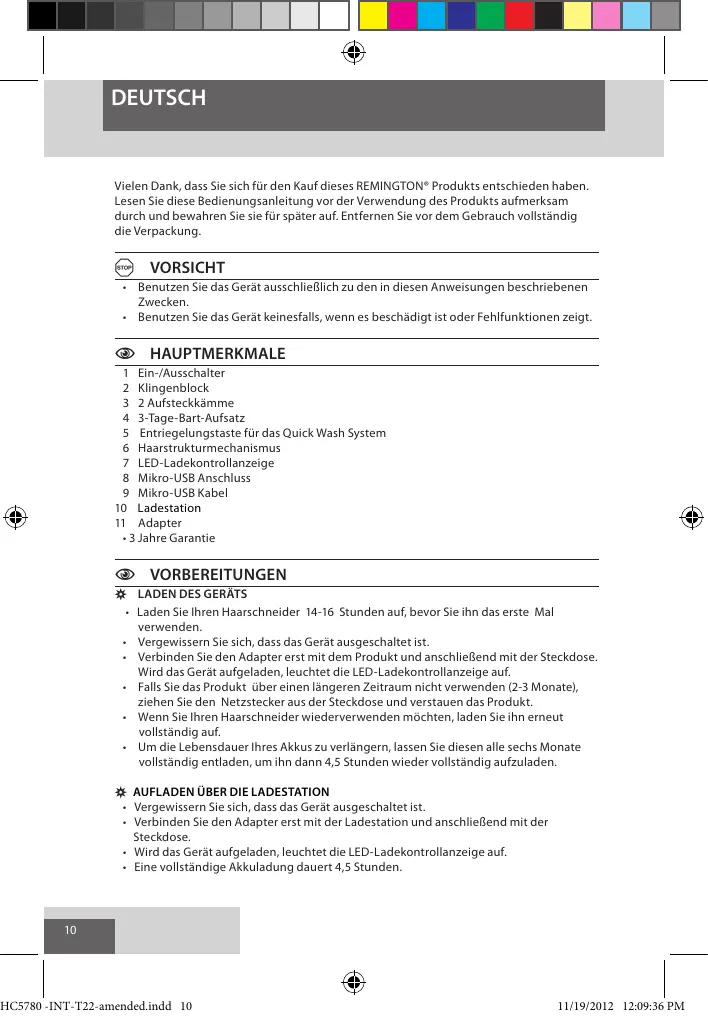 11/19/2012 12:09:36 PM DEUTSCH Vielen Dank, dass Sie sich für den Kauf dieses REMINGTON® Produkts entschieden haben. Lesen Sie diese Bedienungsanleitung vor der Verwendung des Produkts aufmerksam durch und bewahren Sie sie für später auf. Entfernen Sie vor dem Gebrauch vollständig die Verpackung. A VORSICHT