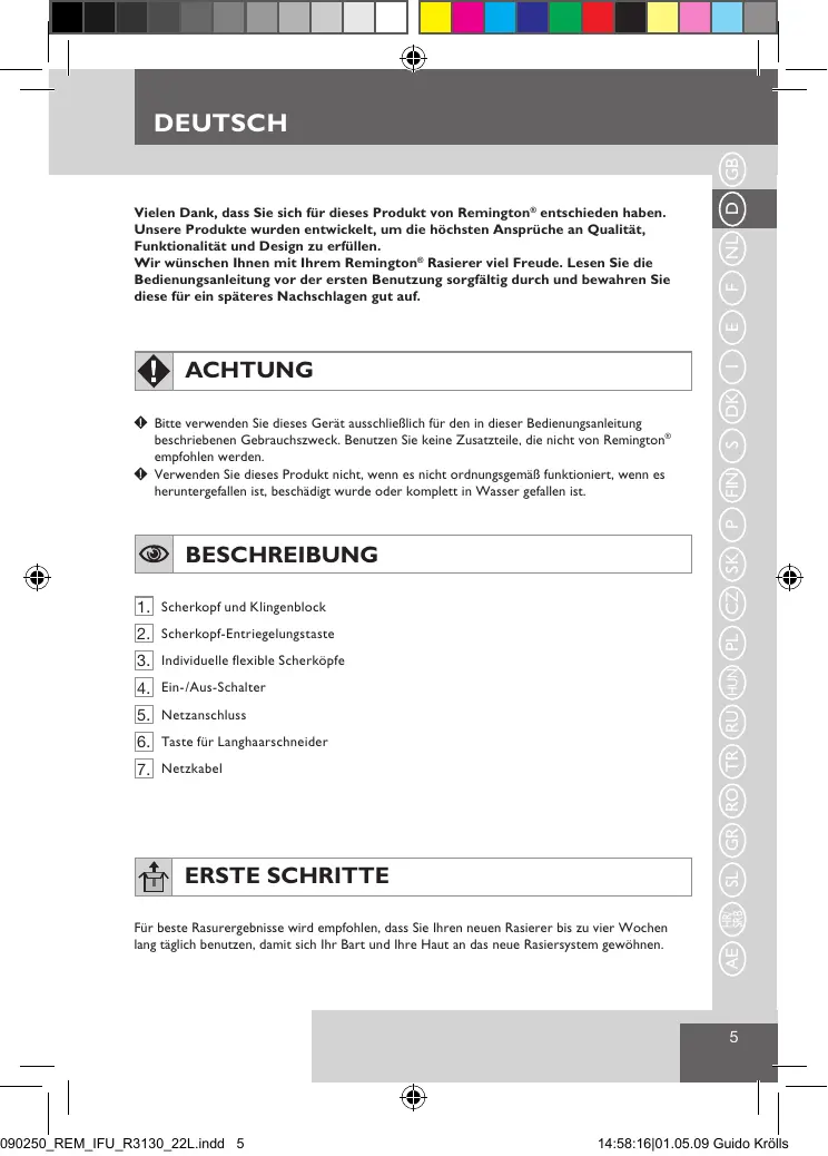 14:58:16|01.05.09 Guido Krölls deutsch WICHTIGE SICHERHEITSHINWEISE WARNUNG - ZUR VERMEIDUNG DER GEFAHR VON VERBRENNUNGEN, STROMSCHLÄGEN, FEUER ODER VERLETZUNGEN AN PERSONEN: E in Elektrogerät sollte niemals unbeaufsichtigt sein, wenn es mit einer stromführenden Steckdose verbunden ist. Eine Ausnahme stellt das Aufl aden der Akkus dar. Halten Sie den Netzstecker und das Netzkabel von warmen Oberfl ächen fern. Achten Sie darauf, dass der Netzstecker und das Netzkabel nicht nass werden. Berühren Sie den Netzstecker oder das Netzkabel des Rasierers nur mit trockenen Händen. Verwenden Sie das Gerät nicht, wenn das Netzkabel beschädigt ist. Ein Ersatzteil können Sie über unsere internationalen Remington®-Servicecenter beziehen. Laden, verwenden und lagern Sie das Gerät bei einer Umgebungstemperatur zwischen 0°C und 32°C. Verwenden Sie nur solche Teile, die mit dem Rasierer geliefert wurden. Use of non Remington® parts with this product may give rise to a hazardous condition. Reinigen und verwenden Sie das Gerät nicht unter fließendem Wasser. Nicht in der Nähe von Kindern aufbewahren. Die Verwendung dieses Geräts durch Personen mit eingeschränkten physischen, sensorischen oder geistigen Fähigkeiten oder mangelnden Erfahrungen und Kenntnissen birgt gewisse Risiken. Für deren Sicherheit verantwortliche Personen sollten ausdrückliche Anweisungen zur Nutzung des Geräts erteilen oder diese überwachen.