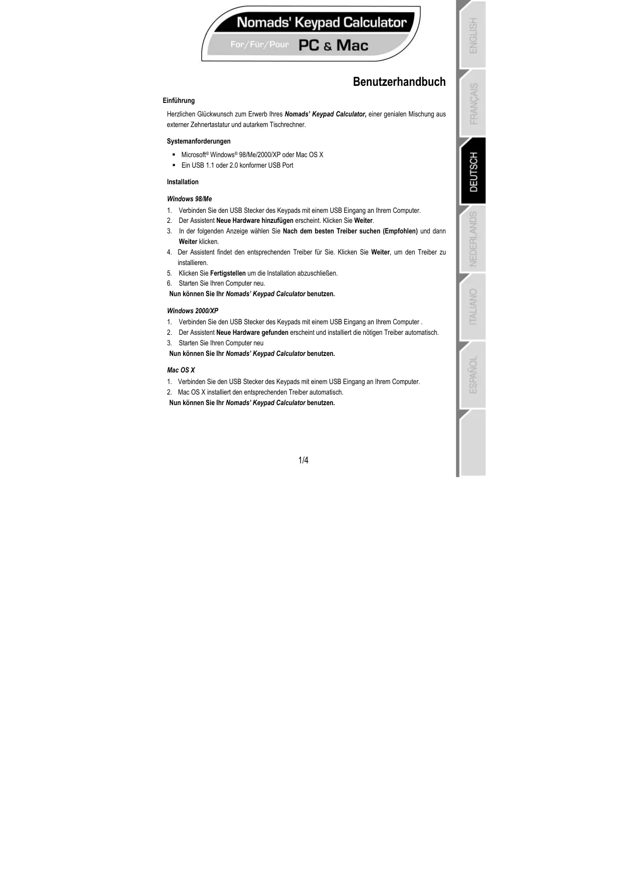 Benutzerhandbuch Einführung Herzlichen Glückwunsch zum Erwerb Ihres Nomads’ Keypad Calculator, einer genialen Mischung aus externer Zehnertastatur und autarkem Tischrechner. Systemanforderungen Microsoft® Windows® 98/Me/2000/XP oder Mac OS X Ein USB 1.1 oder 2.0 konformer USB Port Installation Windows 98/Me 1. Verbinden Sie den USB Stecker des Keypads mit einem USB Eingang an Ihrem Computer. 2. Der Assistent Neue Hardware hinzufügen erscheint. Klicken Sie Weiter. 3. In der folgenden Anzeige wählen Sie Nach dem besten Treiber suchen (Empfohlen) und dann Weiter klicken. 4. Der Assistent findet den entsprechenden Treiber für Sie. Klicken Sie Weiter, um den Treiber zu installieren. 5. Klicken Sie Fertigstellen um die Installation abzuschließen. 6. Starten Sie Ihren Computer neu. Nun können Sie Ihr Nomads’ Keypad Calculator benutzen. Windows 2000/XP 1. Verbinden Sie den USB Stecker des Keypads mit einem USB Eingang an Ihrem Computer . 2. Der Assistent Neue Hardware gefunden erscheint und installiert die nötigen Treiber automatisch. 3. Starten Sie Ihren Computer neu Nun können Sie Ihr Nomads’ Keypad Calculator benutzen. Mac OS X 1. Verbinden Sie den USB Stecker des Keypads mit einem USB Eingang an Ihrem Computer. 2. Mac OS X installiert den entsprechenden Treiber automatisch. Nun können Sie Ihr Nomads’ Keypad Calculator benutzen.
