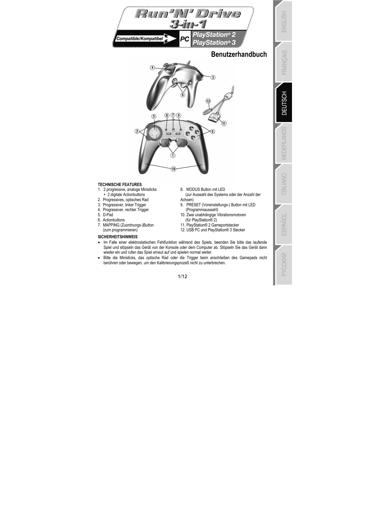 Laden Sie die Anleitung für Ihr Spielzubehör kostenlos im PDF-Format! Finden Sie Ihr Handbuch RUN'N' DRIVE 3-IN-1 - THRUSTMASTER und nehmen Sie Ihr elektronisches Gerät wieder in die Hand. Auf dieser Seite sind alle Dokumente veröffentlicht, die für die Verwendung Ihres Geräts notwendig sind. RUN'N' DRIVE 3-IN-1 von der Marke THRUSTMASTER.
