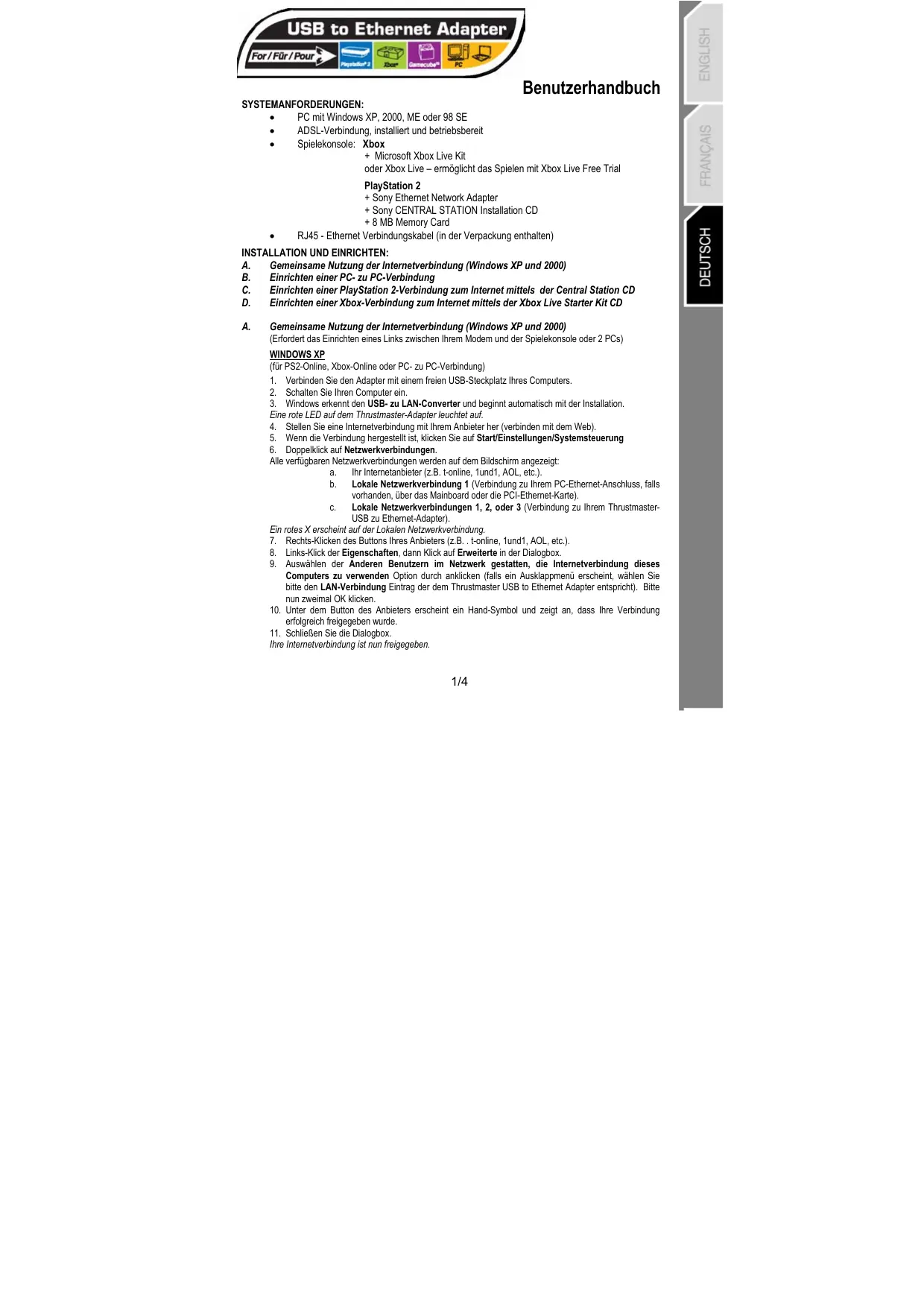 BEDIENUNGSANLEITUNG USB TO ETHERNET ADAPTOR THRUSTMASTER