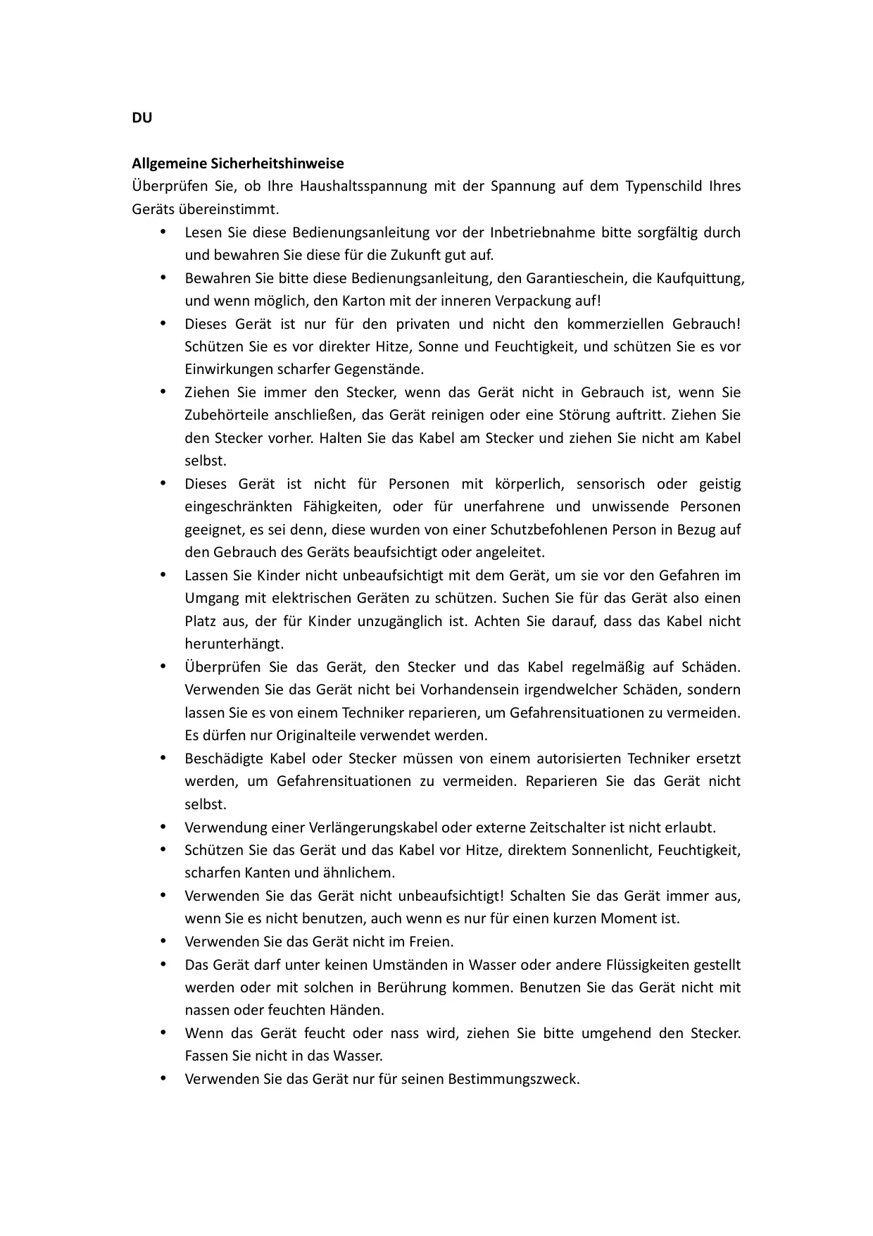 - Dieses Gerät ist nur für den privaten und nicht den kommerziellen Gebrauch! Schützen Sie es vor direkter Hitze, Sonne und Feuchtigkeit, und schützen Sie es vor Einwirkungen scharfer Gegenstände.
