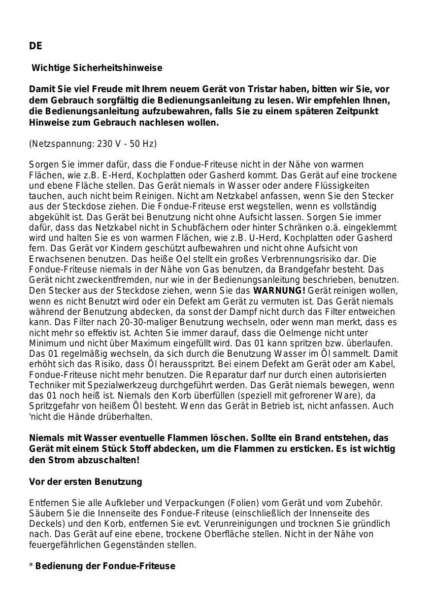 Sorgen Sie immer davon, dass die Fondue-Fritteuse nicht in der Höhe von warmen Flächen, wie z.B. E-Herd, Kochplatten oder Gasherd kommt. Das Gerät auf eine trockene und ebene Fläche stellen. Das Gerät niemals in Wasser oder andere Flüssigkeiten tauchen, auch nicht beim Reinigen. Nicht am Netzkabel anfassen, wenn Sie den Stecker aus der Steckdoseziehen. Die Fondue-Fritteuse erst wegstellen, wenn es vollständig abgekühlt ist. Das Gerät bei Benutzung nicht ohne Aufsicht leassen. Sorgen Sie immer davon, dass das Netzkabel nicht in Schubfächern oder hinter Schranken o.a. eingeklemmt wird und halten Sie es von warmen Flächen, wie z.B. U-Herd, Kochplatten oder Gasherd fern. Das Gerät vor Kindern geschützt aufbewahren und nicht ohne Aufsicht von Erwachsenen benutzen. Das heiße Oel stellt ein große Verbrennungsrisiko dar. Die Fondue-Fritteuse niemals in der Höhe von Gas benutzen, da Brandgefahr besteht. Das Gerät nicht zweckent fremden, nur wie in der Bedienungsanleitung beschreiben, benutzen. Den Stecker aus der Steckdoseziehen, wenn Sie das WARNING! Gerät reinigen wollen, wenn es nicht Benutzt wird oder ein Defekt am Gerät zu vermuten ist. Das Gerät niemals während der Benutzung abdecken, da sonst der Dampf nicht durch das Filter entweichen kann. Das Filter nach 20-30-maliger Benutzung wechseln, oder wenn man merkt, dass es nicht mehr so effektiv ist. Achten Sie immer daraufuf, dass die Oelmenge nicht unter Minimum und nicht über Maximum eingefüllt wird. Das 01 kann spritzen bzw. überlaufen. Das 01 regelmäßige wechseln, da sich durch die Benutzung Wasser im Öl sammelt. Damit erhöht sich das Risiko, dass Öl Herausspritzt. Bei einem Defekt am Gerät oder am Kabel, Fondue-Fritteuse nicht mehr benutzen. Die Reparaturarf nur durch einen autorisierten Techniker mit Spezialwerkzeug durchgeführt werden. Das Gerät niemals bewegen, wenn das 01 noch heiß ist. Niemals den Korb überfüllen (speziell mit gefrorener Ware), da Spritzgefahr von heißem Öl besteht. Wenn das Gerät in Betrieb ist, nicht anfassen. Auch 'nicht die Hände drüberhalten.