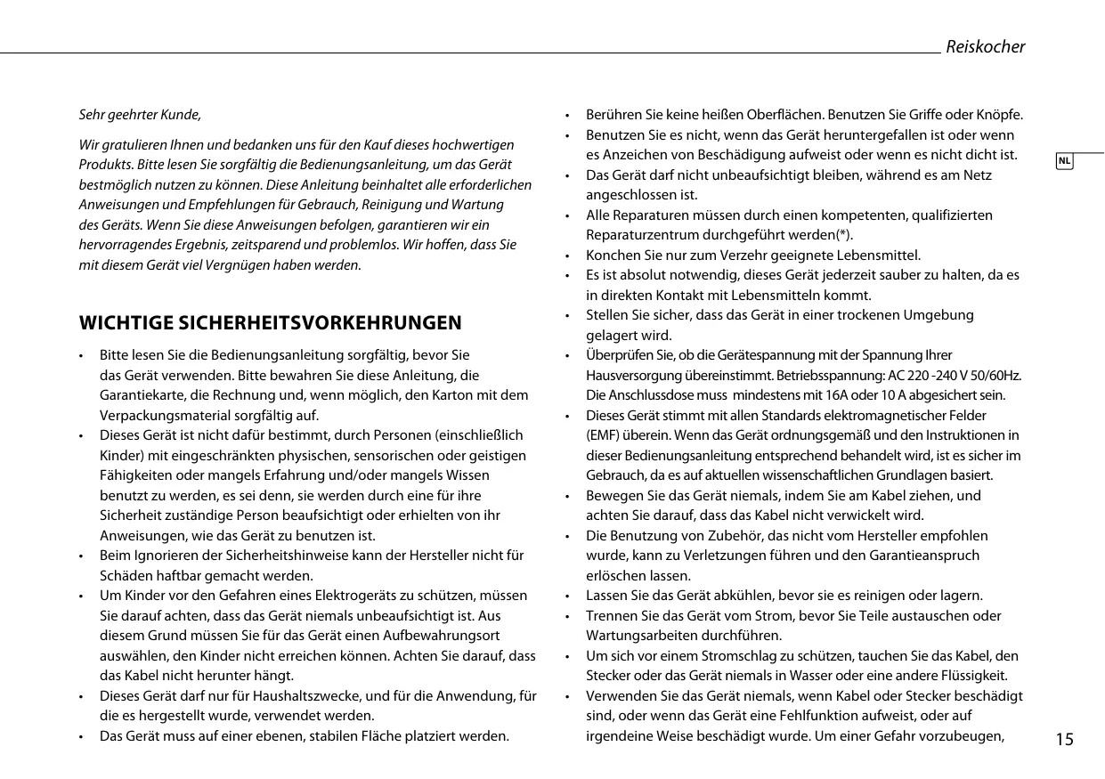 - Beim Einstecken des Kochers immer sicherstellen, dass der Innentopf Flüssigkeit enthalt oder sofort Öl, Butter oder Margarine in den Topf füssen.