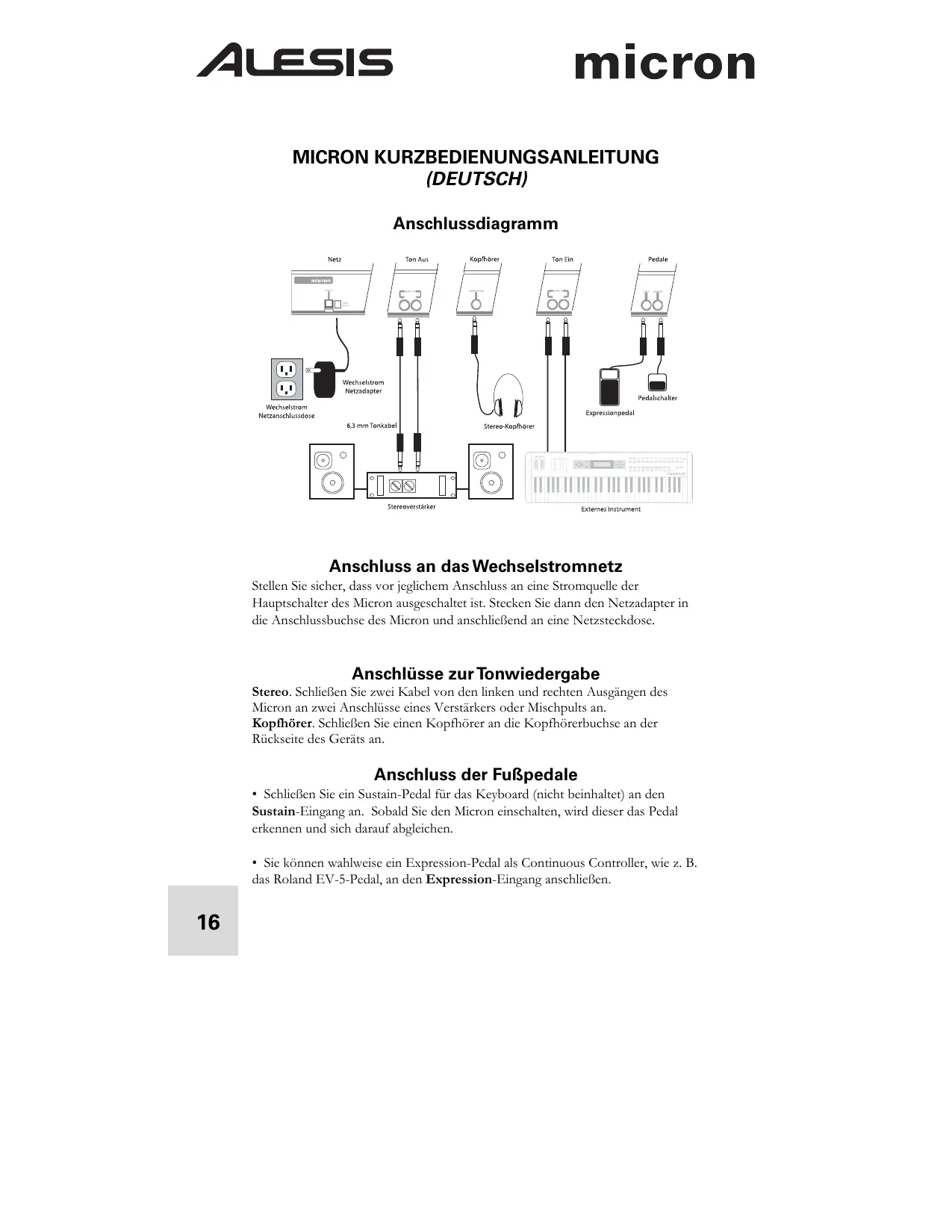 MICRON KURZBEDIENUNGSANLEITUNG (DEUTSCH) Anschlussdiagramm Anschluss an das Wechselstromnetz Stellen Sie sicher, dass vor jeglichem Anschluss an eine Stromquelle der Hauptschalter des Micron ausgeschaltet ist. Stecken Sie dann den Netzadapter in die Anschlussbuchse des Micron und anschließend an eine Netzsteckdose. Anschlüsse zur Tonwiedergabe Stereo. Schließen Sie zwei Kabel von den linken und rechten Ausgängen des Micron an zwei Anschlüsse eines Verstärkers oder Mischpults an. Kopfhörer. Schließen Sie einen Kopfhörer an die Kopfhörerbuchse an der Rückseite des Geräts an. Anschluss der Fußpedale