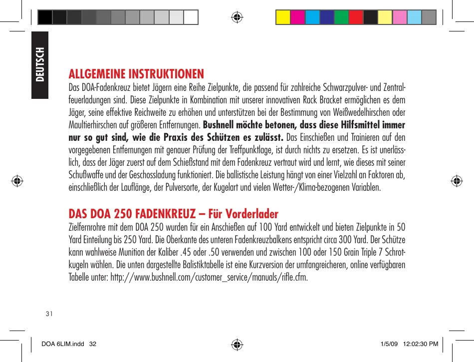 DOA 6LIM.indd 31 1/5/09 12:02:30 PM DEUTSCH ALLGEMEINE INSTRUKTIONEN Das DOA-Fadenkreuz bietet Jägern eine Reihe Zielpunkte, die passend für zahlreiche Schwarzpulver- und Zentralfeuerladungen sind. Diese Zielpunkte in Kombination mit unserer innovativen Rack Bracket ermöglichen es dem Jäger, seine effektive Reichweite zu erhöhen und unterstützen bei der Bestimmung von Weißwedelhirschen oder Maultierhirschen auf größeren Entfernungen. Bushnell möchte betonen, dass diese Hilfsmittel immer nur so gut sind, wie die Praxis des Schützen es zulässt. Das Einschießen und Trainieren auf den vorgegebenen Entfernungen mit genauer Prüfung der Treffpunktlage, ist durch nichts zu ersetzen. Es ist unerlässlich, dass der Jäger zuerst auf dem Schießstand mit dem Fadenkreuz vertraut wird und lernt, wie dieses mit seiner Schußwaffe und der Geschossladung funktioniert. Die ballistische Leistung hängt von einer Vielzahl an Faktoren ab, einschließlich der Lauflänge, der Pulversorte, der Kugelart und vielen Wetter-/Klima-bezogenen Variablen. DAS DOA 250 FADENKREUZ – Für Vorderlader Zielfernrohre mit dem DOA 250 wurden für ein Anschießen auf 100 Yard entwickelt und bieten Zielpunkte in 50 Yard Einteilung bis 250 Yard. Die Oberkante des unteren Fadenkreuzbalkens entspricht circa 300 Yard. Der Schütze kann wahlweise Munition der Kaliber .45 oder .50 verwenden und zwischen 100 oder 150 Grain Triple 7 Schrotkugeln wählen. Die unten dargestellte Balistiktabelle ist eine Kurzversion der umfangreicheren, online verfügbaren Tabelle unter: http://www.bushnell.com/customer_service/manuals/rifle.cfm.