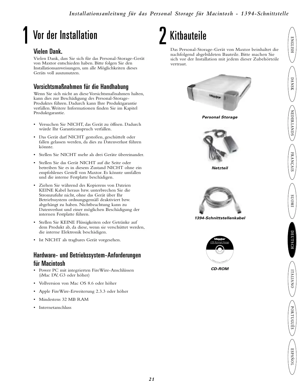 Installationsanleitung für das Personal Storage für Macintosh - 1394-Schnittstelle 2 Kitbauteile Das Personal-Storage-Gerät von Maxtor beinhaltet die nachfolgend abgebildeten Bauteile. Bitte machen Sie sich vor der Installation mit jedem dieser Zubehörteile vertraut. Vielen Dank. Vielen Dank, dass Sie sich für das Personal-Storage-Gerät von Maxtor entschieden haben. Bitte folgen Sie den Installationsanweisungen, um alle Möglichkeiten dieses Geräts voll auszunutzen. ENGLISH 1 Vor der Installation DANSK Vorsichtsmaßnahmen für die Handhabung Personal Storage