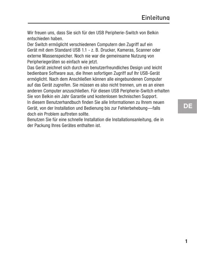 Einleitung Wir freuen uns, dass Sie sich für den USB Peripherie-Switch von Belkin entschieden haben. Der Switch ermöglicht verschiedenen Computern den Zugriff auf ein Gerät mit dem Standard USB 1.1 - z. B. Drucker, Kameras, Scanner oder externe Massenspeicher. Noch nie war die gemeinsame Nutzung von Peripheriegeräten so einfach wie jetzt. Das Gerät zeichnet sich durch ein benutzerfreundliches Design und leicht bedienbare Software aus, die Ihnen sofortigen Zugriff auf Ihr USB-Gerät ermöglicht. Nach dem Anschließen können alle eingebundenen Computer auf das Gerät zugreifen. Sie müssen es also nicht trennen, um es an einen anderen Computer anzuschließen. Für diesen USB Peripherie-Switch erhalten Sie von Belkin ein Jahr Garantie und kostenlosen technischen Support. In diesem Benutzerhandbuch finden Sie alle Informationen zu Ihrem neuen Gerät, von der Installation und Bedienung bis zur Fehlerbehebung—falls doch ein Problem auftreten sollte. Benutzen Sie für eine schnelle Installation die Installationsanleitung, die in der Packung Ihres Gerätes enthalten ist.
