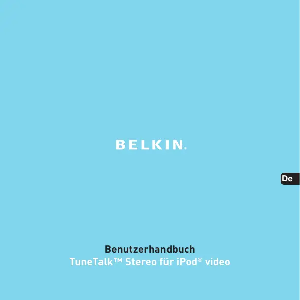 Benutzerhandbuch TuneTalk™ Stereo für iPod®Einleitung video Einleitung Wir gratulieren Ihnen zum Kauf dieses innovativen Mobilitätsprodukts von Belkin. Bitte lesen Sie diese Gebrauchsanweisung sorgfältig durch, um wirklich alle Vorteile des TuneTalk Stereo für iPod video zu nutzen. Verpackungsinhalt: Kompakter iPod-Ständer Kunststoffabstandhalter TuneTalk Stereo für iPod video USB-Kabel Einleitung | 01 iPod nicht enthalten Verwenden des TuneTalk Stereo Zum Einstellen der Aufnahmequalität: Wählen Sie „Extras > Voice Memos > Quality” (Extras > Sprachmemos > Qualität) im iPod-Menü. Durch Drücken der Taste „Select” (Auswählen) kann zwischen Niedrig (22,05 kHz, Mono) oder Hoch (44,1kHz, Stereo) umgeschaltet werden. Aufnahme: