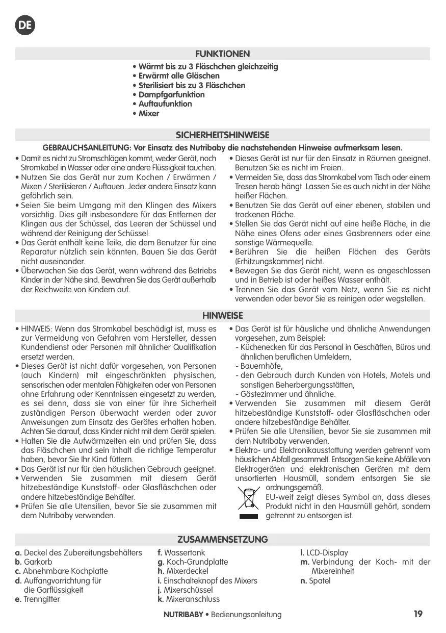 • Das Gerät ist für häusliche und ähnliche Anwendungen vorgesehen, zum Beispiel: - Küchenecken für das Personal in Geschäften, Büros und ähnlichen beruflichen Umfeldern, - Bauernhöfe, - den Gebrauch durch Kunden von Hotels, Motels und sonstigen Beherbergungsstätten, - Gästezimmer und ähnliche. • Verwenden Sie zusammen mit diesem Gerät hitzebeständige Kunststoff- oder Glasfläschchen oder andere hitzebeständige Behälter. • Prüfen Sie alle Utensilien, bevor Sie sie zusammen mit dem Nutribaby verwenden. • Elektro- und Elektronikausstattung werden getrennt vom häuslichen Abfall gesammelt. Entsorgen Sie keine Abfälle von Elektrogeräten und elektronischen Geräten mit dem unsortierten Hausmüll, sondern entsorgen Sie sie ordnungsgemäß. EU-weit zeigt dieses Symbol an, dass dieses Produkt nicht in den Hausmüll gehört, sondern getrennt zu entsorgen ist.