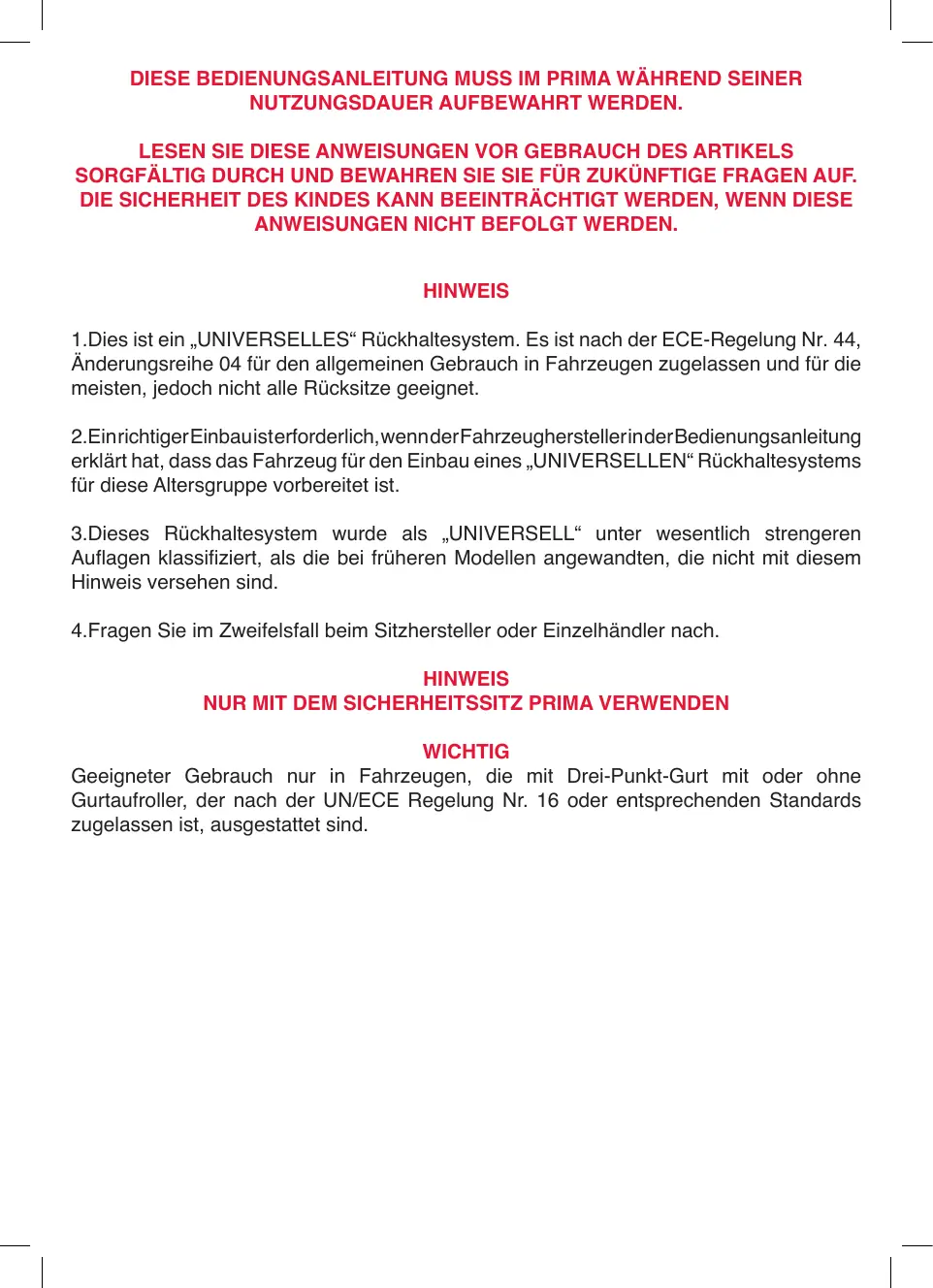 IMPORTANT ! Utilisez la base Prima uniquement avec le siège auto RC/RCS groupe 0. AVERTISSEMENT : La base Prima appartient au groupe 0 (pour un enfant de la naissance jusqu’à 10 kilos). AVIS 1.Ce système est un système de retenue « UNIVERSEL ». Il est homologué selon la Norme N°44, série d’amendements 04, pour une utilisation générale dans les véhicules et approprié à la majorité des sièges de voiture, mais pas tous. 2.Une installation correcte est possible si le fabricant du véhicule a précisé dans le manuel d’instructions que le véhicule est apte à recevoir un système de retenue « UNIVERSEL » pour cette tranche d’âge. 3.Ce système de retenue a été classé « UNIVERSEL » sous des conditions plus strictes que celles qui s’appliquaient aux modèles antérieurs qui ne portaient pas cette mention. 4.En cas de doute, consultez le fabricant ou le revendeur du siège auto. AVIS UTILISER UNIQUEMENT AVEC LE SIÈGE AUTO PRIMA IMPORTANT Utilisation appropriée uniquement dans les véhicules équipés de ceintures à trois points avec ou sans rétracteur, homolguées par la UN/ECE 16 ou autres standards équivalents.