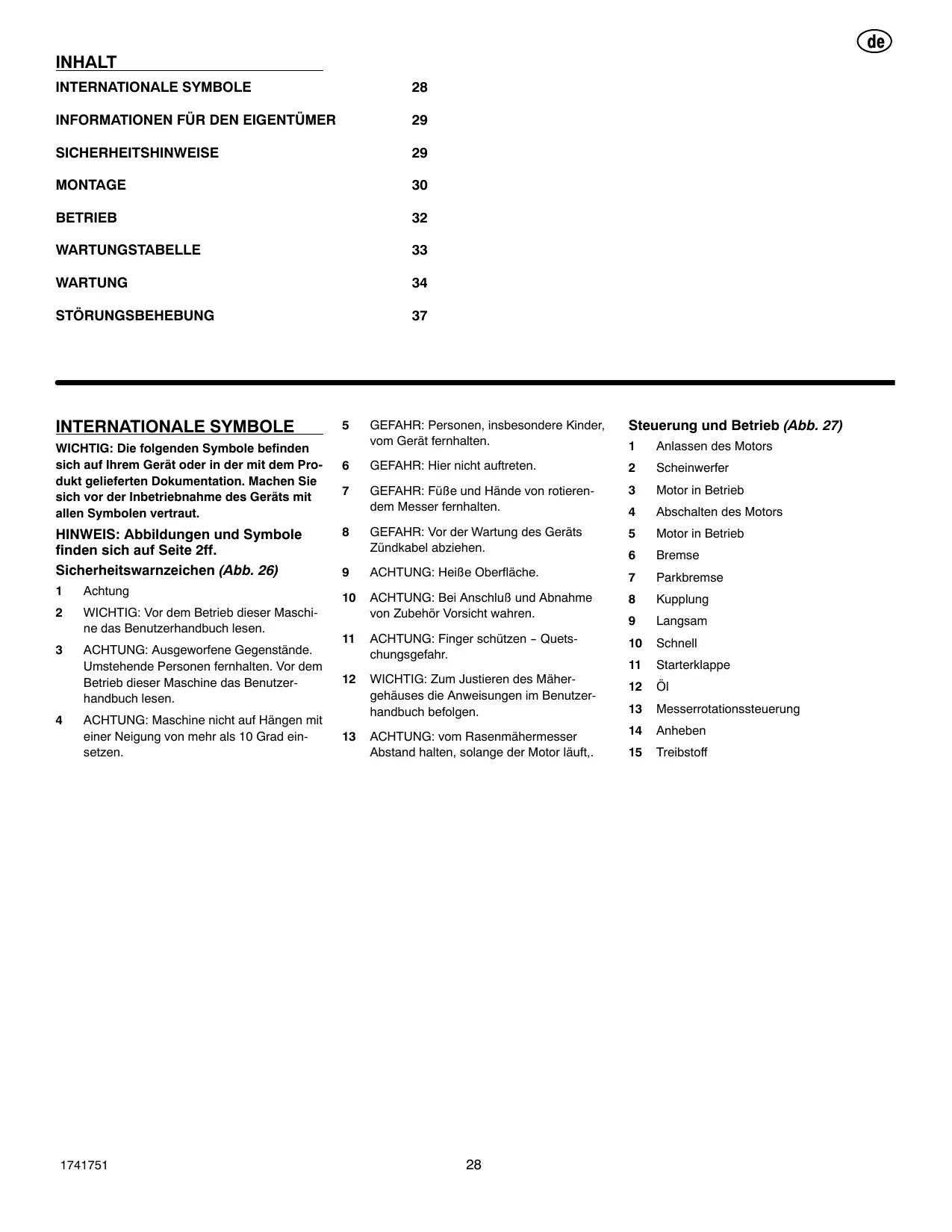 ACHTUNG: Ausgeworfene Gegenstände. Umstehende Personen fernhalten. Vor dem Betrieb dieser Maschine das Benutzerhandbuch lesen. ACHTUNG: Maschine nicht auf Hängen mit einer Neigung von mehr als 10 Grad einsetzen.