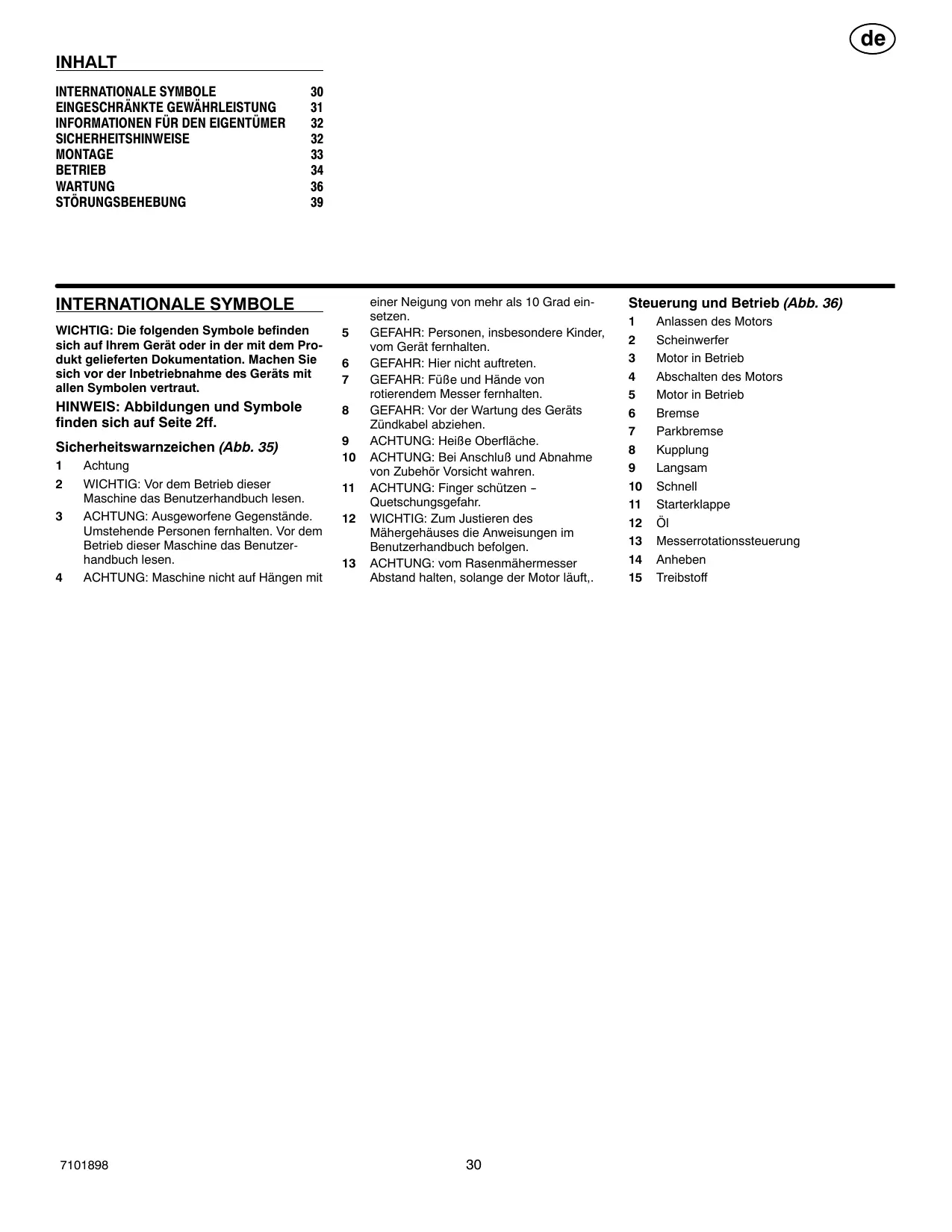 DANGER: Ne pas poser le pied. DANGER: Gardez vos pieds et mains à distance de la lame rotative. DANGER: Débrancher le câble de la bougie avant toute inspection de l’appareil. AVERTISSEMENT: Surface brûlante. AVERTISSEMENT: Prêter attention lors du branchement et débranchement des accessoires. AVERTISSEMENT: Prendre garde à ne pas s’écraser les doigts. IMPORTANT: Pour régler le niveau du carter du bloc de coupe, suivre attentivement les instructions indiquées dans le Guide de l’utilisateur.